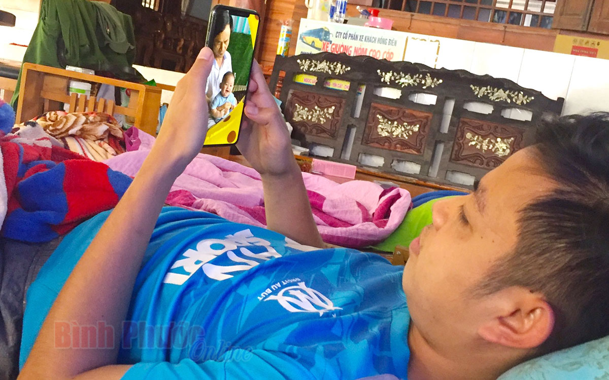 Trực chiến tại chốt kiểm soát giao thông, phòng chống dịch, vào những giờ nghỉ ca, Thượng úy Bùi Tấn Thành tranh thủ nhìn và hỏi thăm con qua điện thoại cho khuây khỏa nỗi nhớ nhung