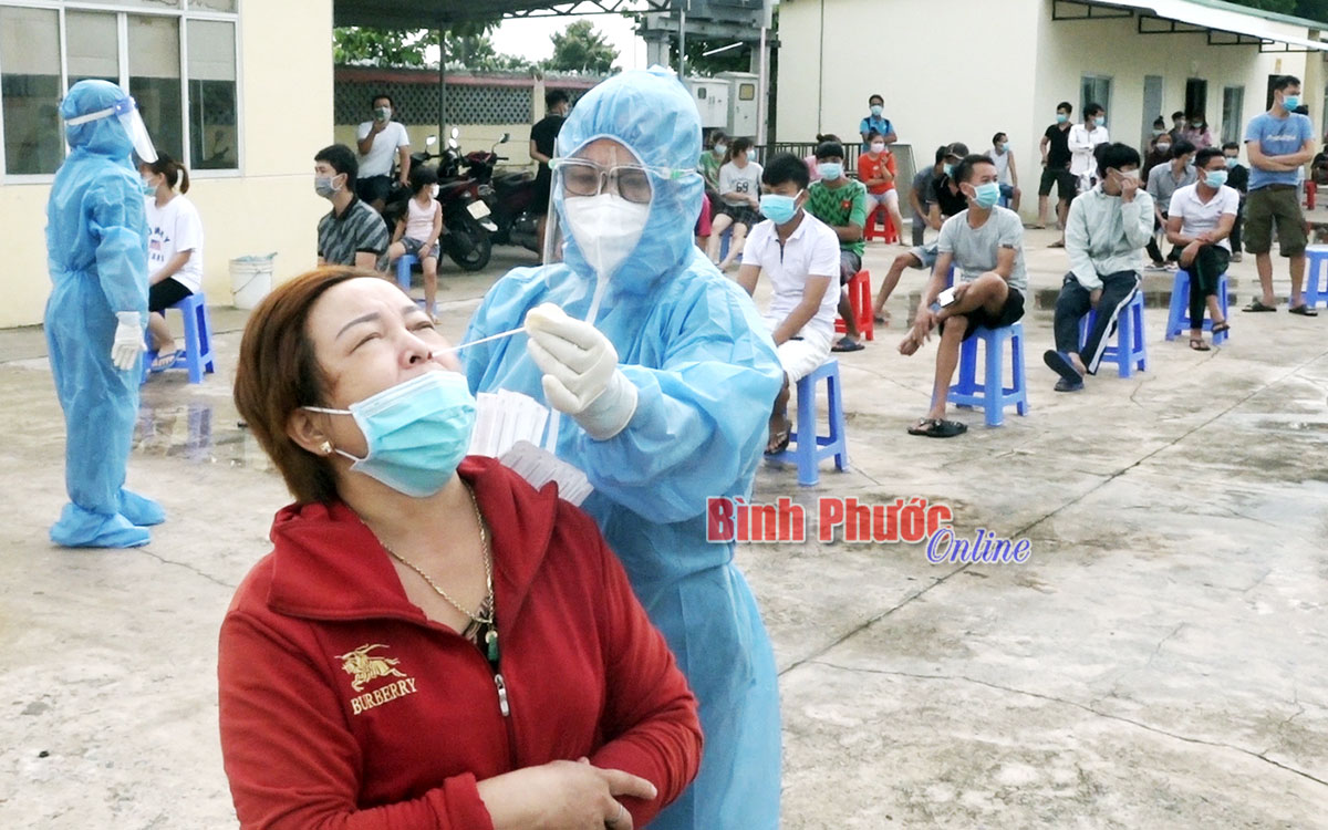 Nhân viên y tế lấy mẫu xét nghiệm đối với công nhân Công ty TNHH MTV Rui Feng, Khu công nghiệp Chơn Thành 1
