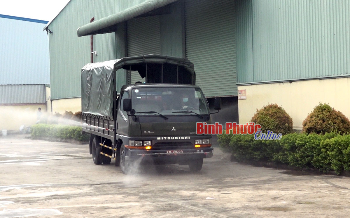 Xe chuyên dụng của Ban CHQS huyện Chơn Thành phun xịt khử khuẩn tại Công ty TNHH MTV Rui Feng, Khu công nghiệp Chơn Thành 1
