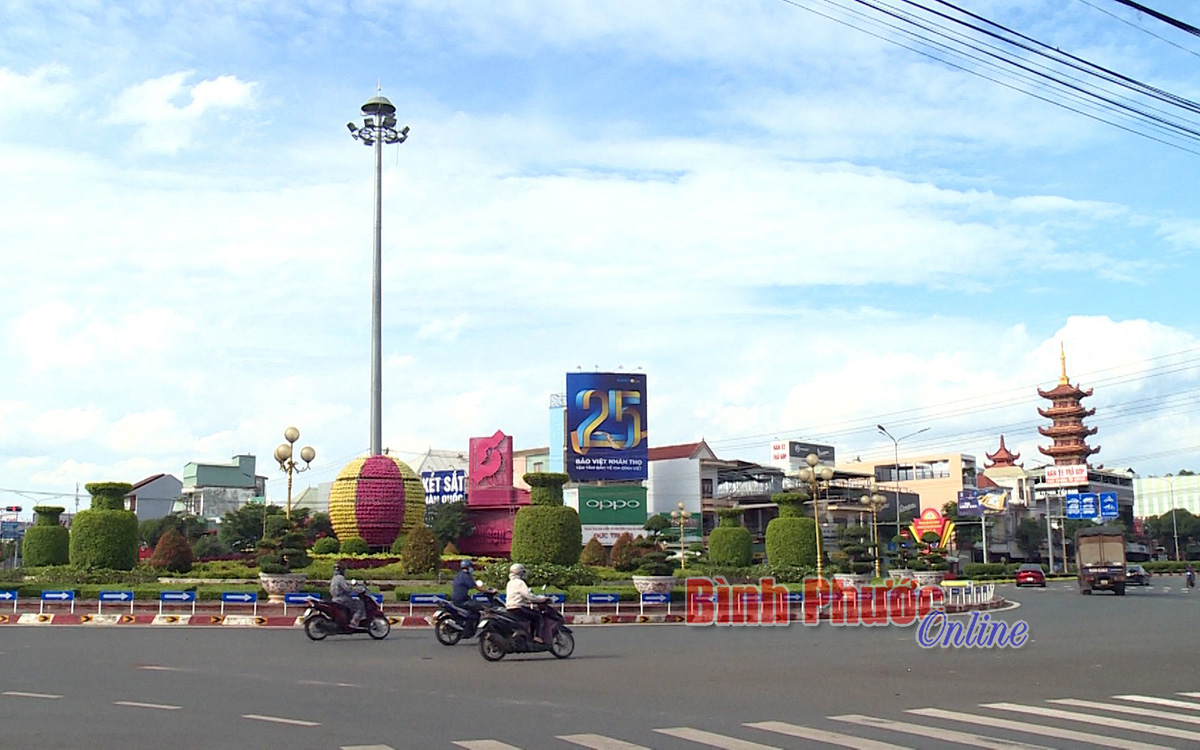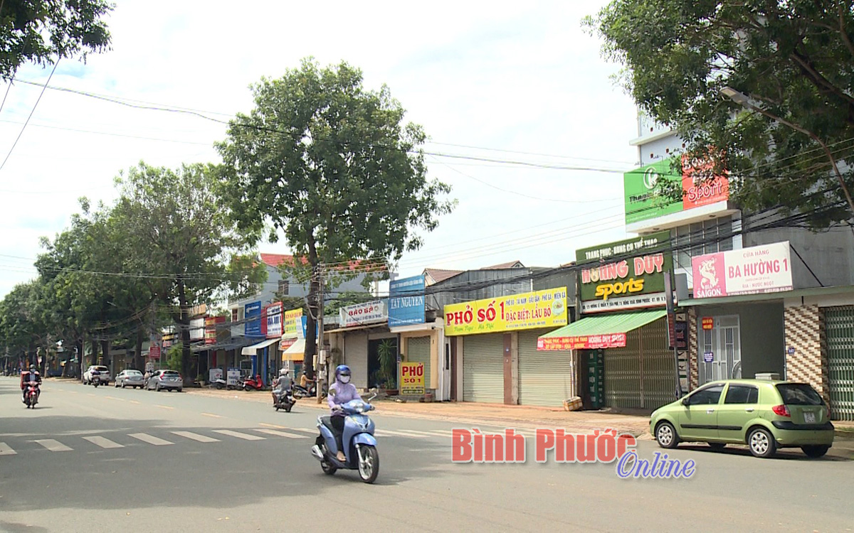Một góc trung tâm thành phố Đồng Xoài thưa vắng người qua lại khi thực hiện việc giãn cách toàn xã hội. Ảnh: Trương Hiện
