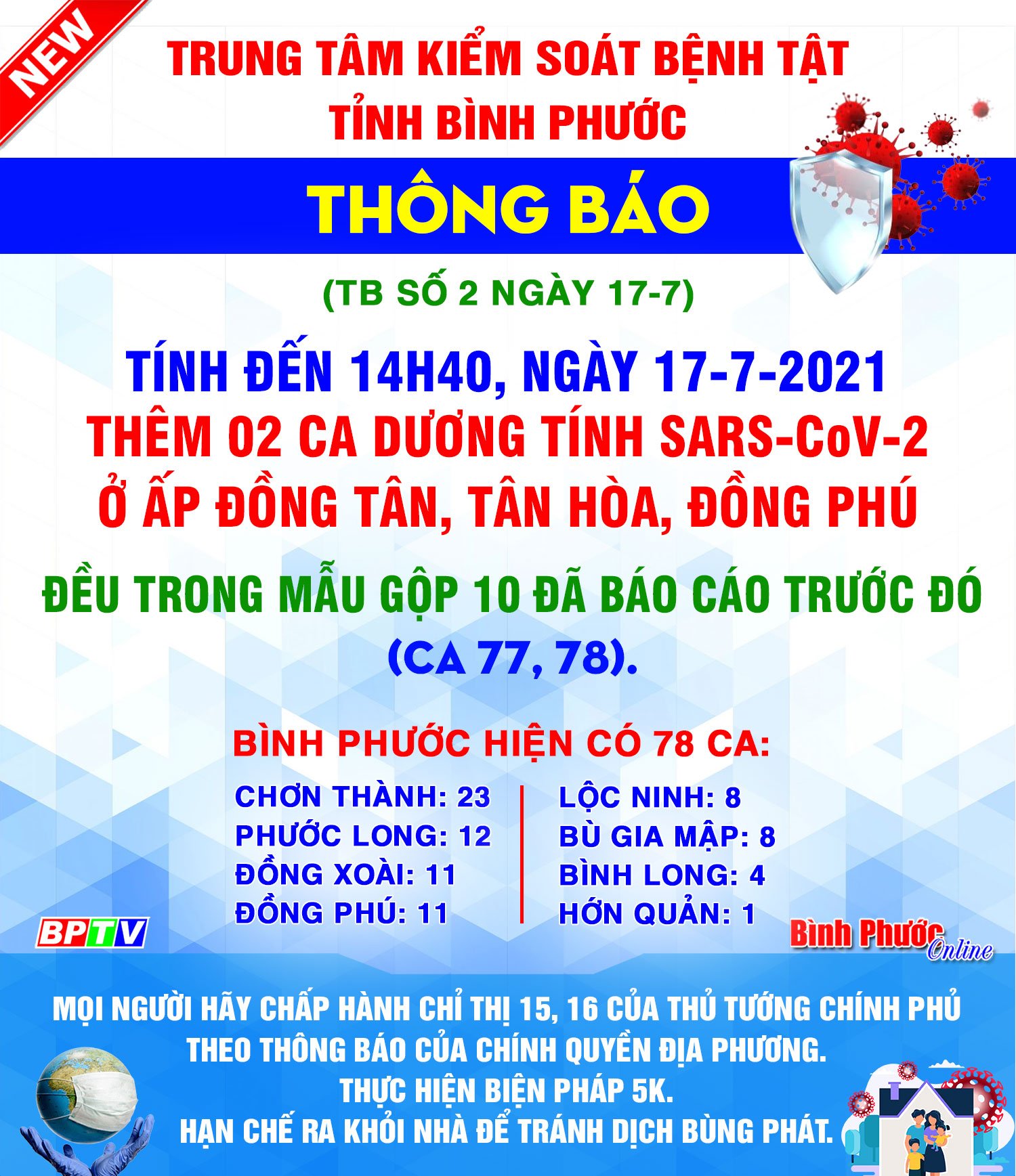 Tính đến chiều nay (17-7), tỉnh Bình Phước có 78 ca dương tính với Covid-19, gồm: Chơn Thành 23, Phước Long 12, Đồng Xoài 11, Đồng Phú 11, Bù Gia Mập 8, Lộc Ninh 8, Bình Long 4, Hớn Quản 1 ca.