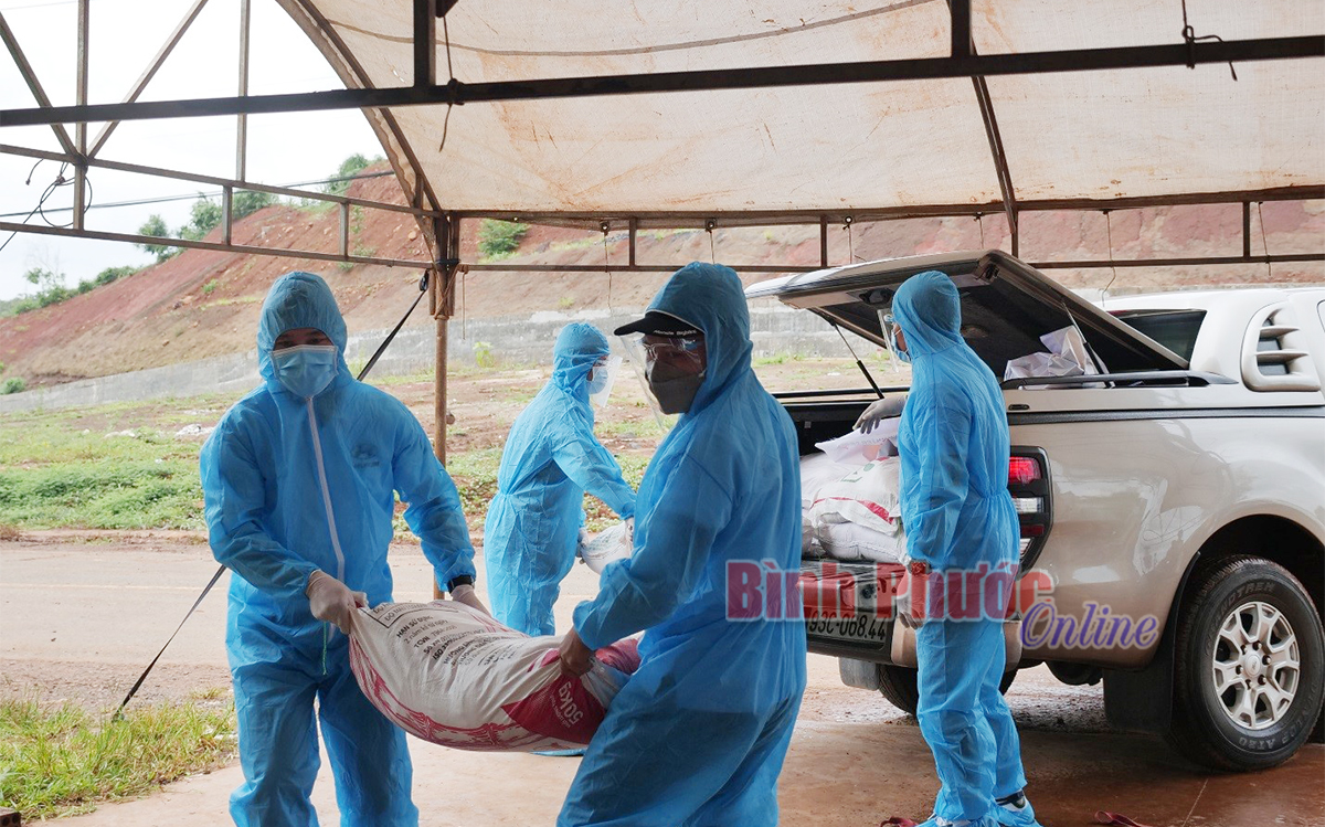 Không được vào các khu phong tỏa nên gạo đã được sang xe chở vào điểm tiếp nhận để tặng cho người dân bị phong tỏa xã Phú Văn (Bù Gia Mập)
