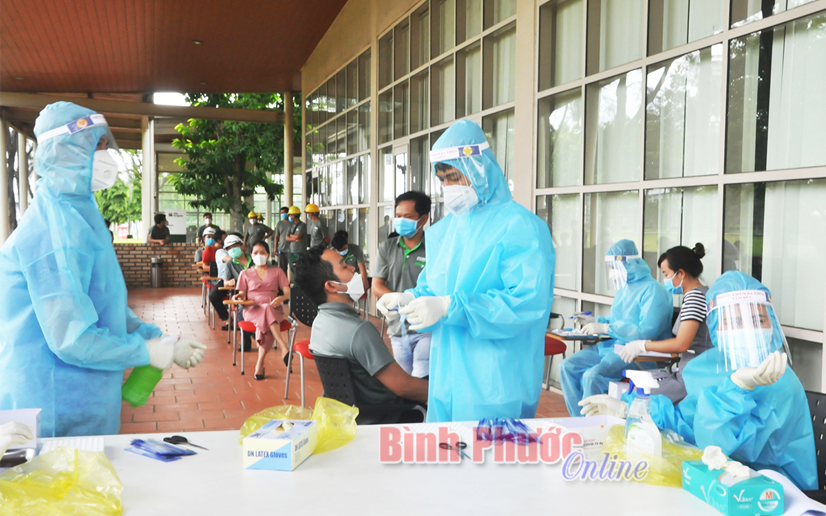 Lấy mẫu test nhanh cho công nhân Công ty cổ phần gỗ MDF VRG Dongwha, Khu công nghiệp Minh Hưng 3, huyện Chơn Thành thực hiện phương án “3 tại chỗ”