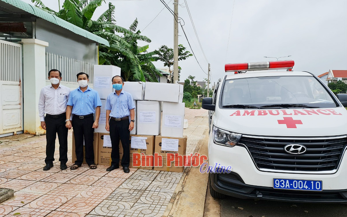 Giám đốc Sở Tài chính Lê Tấn Nam và Chủ tịch UBND thành phố Đồng Xoài Nguyễn Minh Bình trao vật tư y tế do doanh nghiệp hỗ trợ Trung tâm y tế thành phố Đồng Xoài