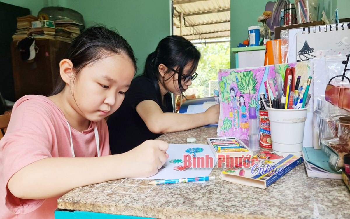 Hầu hết thời gian nghỉ hè, hai chị em Nguyễn Mai Thi, phường Long Phước, thị xã Phước Long dành thời gian để rèn luyện kỹ năng vẽ tranh