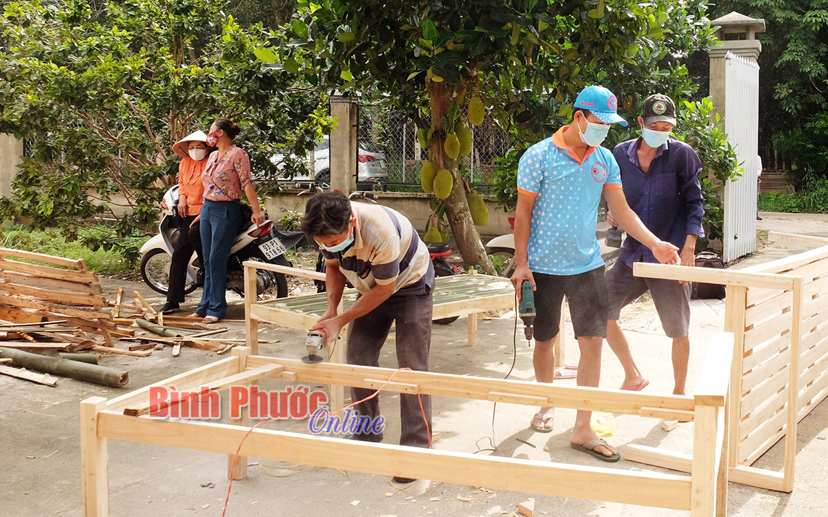 Mỗi người một việc, người dân ấp Sóc Ruộng 2, xã Tân Quan, huyện Hớn Quản đang khẩn trương hoàn thiện để những chiếc giường sớm được đưa đến khu cách ly tập trung