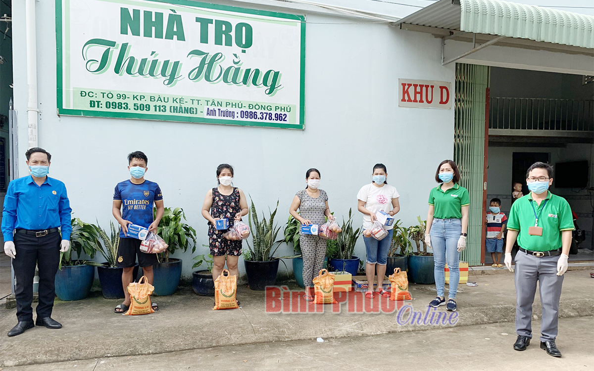 Đại diện Chi đoàn BPTV và Liên đoàn lao động trao tặng quà cho công nhân lưu trú tại nhà trọ Thúy Hằng