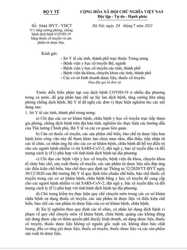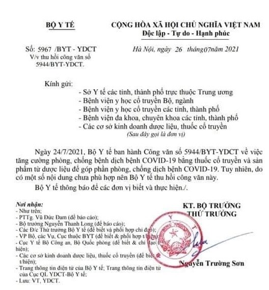 Bộ Y tế thu hồi công văn 5944/BYT-YDCT về việc tăng cường phòng, chống dịch COVID-19 bằng thuốc cổ truyền và sản phẩm từ dược liệu