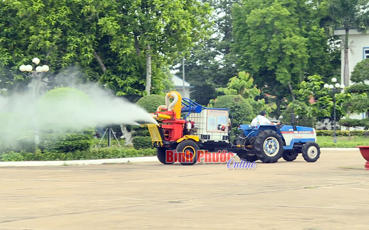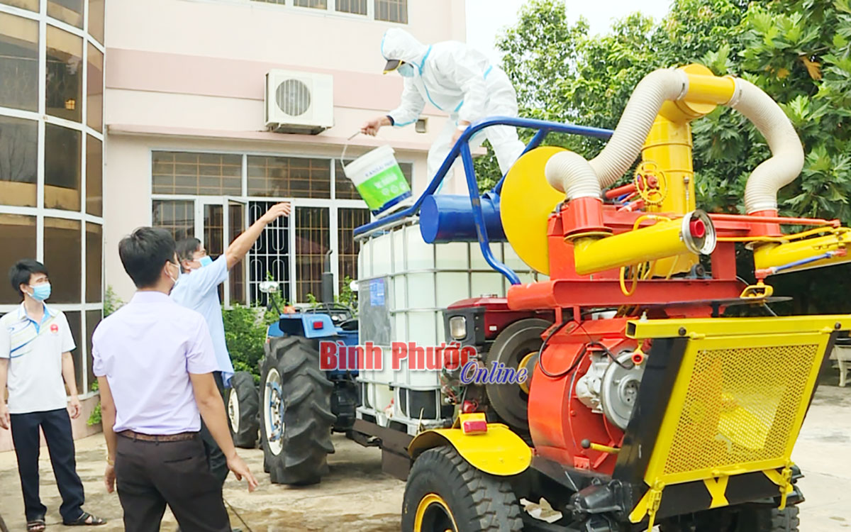 Trung tâm đã sử dụng xe phun thuốc 5 trong 1 của nhà nông Nguyễn Văn Lĩnh, phường Tân Xuân, thành phố Đồng Xoài để tiến hành phun hóa chất khử khuẩn.