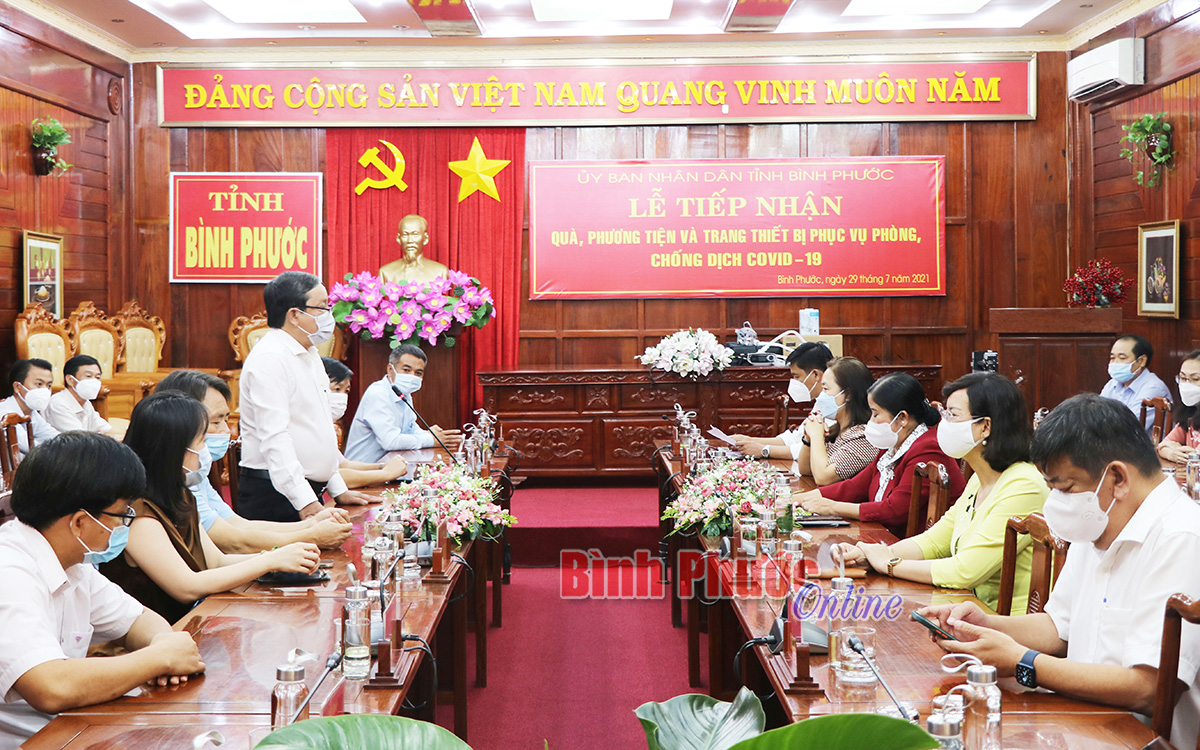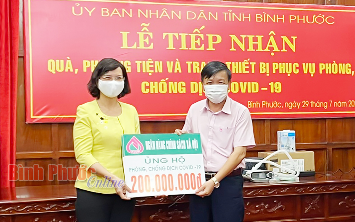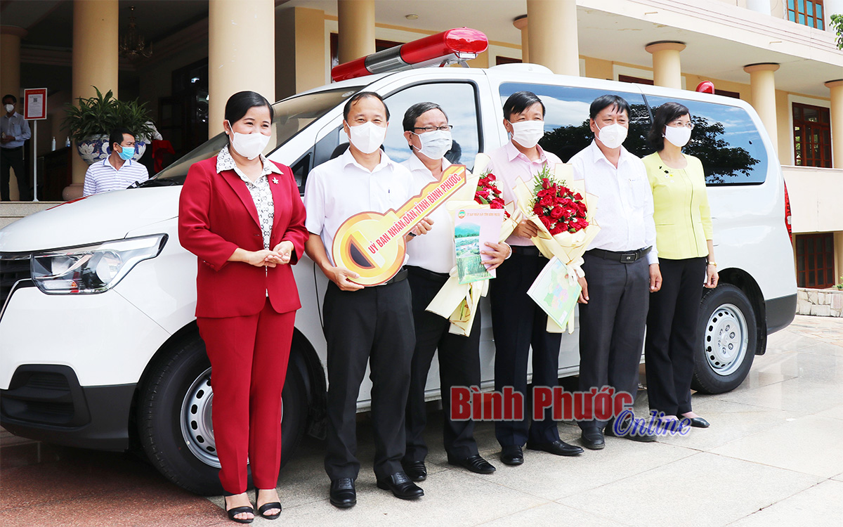 Tại buổi tiếp nhận, đại diện Ngân hàng Vietcombank - Chi nhánh Bình Phước trao tặng 1 tỷ 200 triệu đồng của Ngân hàng Vietcombank Việt Nam. Đại diện Ngân hàng Chính sách xã hội Việt Nam tỉnh trao tặng 200 triệu đồng của Ngân hàng Chính sách xã hội Việt Nam và 100 triệu đồng Ngân hàng Chính sách xã hội Việt Nam tỉnh. Số tiền 1 tỷ 500 triệu đồng được tỉnh sử dụng mua 2 xe cứu thương mới hiệu Hyundai được trang bị đầy đủ thiết bị y tế như: cáng cứu thương, đèn trần, đèn soi thanh treo, bình oxy... để bàn giao cho thị xã Phước Long và huyện Đồng Phú.