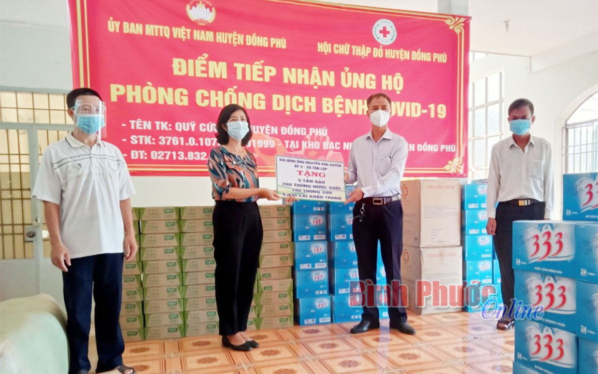 Do tuổi cao, sức yếu cụ Xuyến không thể trao trực tiếp, do đó, đại diện gia đình cụ đã đến UBMTTQVN huyện Đồng Phú trao 5 tấn gạo, 200 thùng nước suối, 100 thùng sữa và 5.000 khẩu trang y tế… với tổng trị giá 115 triệu đồng.