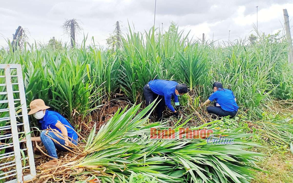 Đội hình thanh niên tình nguyện cắt cỏ chăm sóc vật nuôi cho các gia đình đang thực hiện cách ly