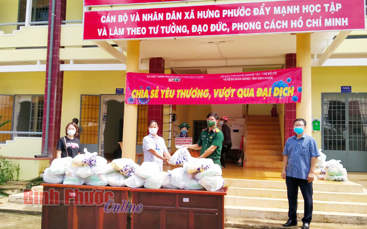 Nắm bắt được khó khăn của bà con nghèo, đồng bào dân tộc thiểu số trong thời gian thực hiện giãn cách xã hội theo Chỉ thị 16/CT-TTg của Thủ tướng Chính phủ, đơn vị đã phối hợp với Đài Phát thanh - Truyền hình và Báo Bình Phước, Hội Bảo trợ người khuyết tật, trẻ mồ côi và bệnh nhân nghèo tỉnh thăm, tặng 200 phần quà là nhu yếu phẩm với tổng trị giá hơn 50 triệu đồng tại 2 xã Hưng Phước và Phước Thiện. Nhằm kịp thời động viên các chiến sĩ, đơn vị đã phối hợp với doanh nghiệp Thức Cafe tặng 8 phần quà cho gia đình chiến sĩ hoàn cảnh khó khăn bị ảnh hưởng bởi dịch Covid-9, mỗi phần trị giá 1,2 triệu đồng, giúp các chiến sĩ an tâm thực hiện nhiệm vụ trong thời gian quân ngũ.