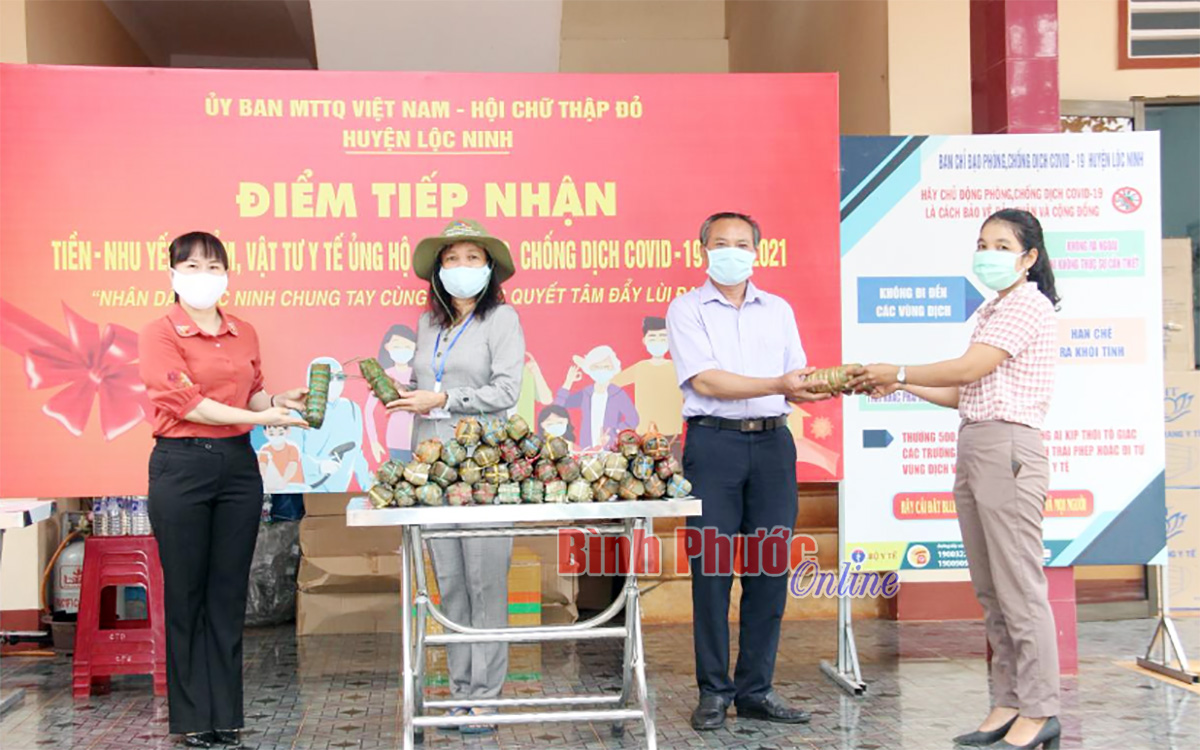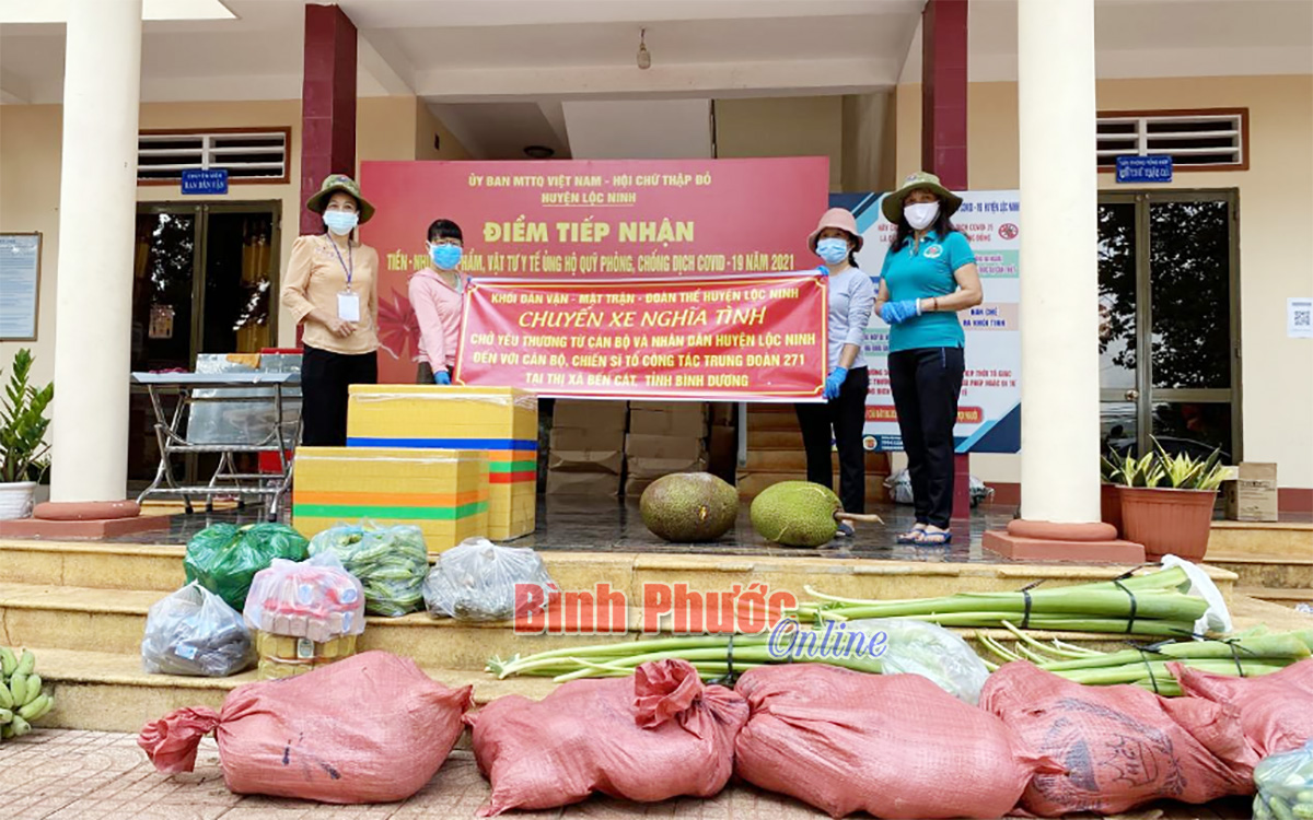 Ngoài “chia lửa” với các đơn vị, tỉnh, thành bạn, hơn 1 tháng qua, huyện Lộc Ninh đã tiếp nhận các phần quà, tiền mặt cùng 200.000 khẩu trang của các tổ chức, cá nhân, doanh nghiệp và người dân trao tặng, hỗ trợ công tác phòng, chống dịch Covid-19 với tổng trị giá hơn 4,8 tỷ đồng. Từ số tiền, quà tiếp nhận được, ngoài hỗ trợ các lực lượng tuyến đầu chống dịch, huyện còn dành tặng 1.600 trường hợp F2 và 60 gia đình nạn nhân chất độc da cam/dioxin khó khăn do ảnh hưởng của dịch Covid-19, mỗi phần trị giá từ 200-300 ngàn đồng. Sắp tới huyện sẽ tổng hợp, rà soát, lập danh sách các hộ nghèo, cận nghèo, dân tộc thiểu số khó khăn để hỗ trợ. Dự kiến mỗi phần quà khoảng 300 ngàn đồng từ nguồn kinh phí vận động được.