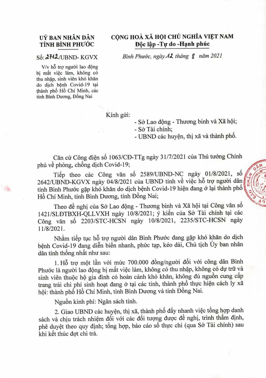 Trước đó, ngày 4-8, Chủ tịch UBND tỉnh Bình Phước Trần Tuệ Hiền cũng có công văn 2642/UBND-KGVX về việc hỗ trợ công dân Bình Phước gặp khó khăn do dịch Covid-19 hiện đang ở lại Thành phố Hồ Chí Minh, hai tỉnh Bình Dương và Đồng Nai. Trong đó, những người thuộc hộ nghèo, hộ cận nghèo, người khuyết tật đang ở tại thành phố Hồ Chí Minh, Bình Dương, Đồng Nai sẽ được UBND tỉnh Bình Phước hỗ trợ 1 lần với mức 1 triệu đồng/người, thông qua dịch vụ chuyển tiền bưu điện.