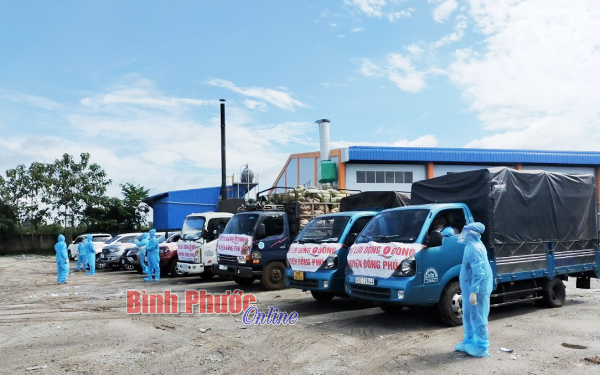 Trong tổng 30 tấn hàng hóa các loại, có 3,5 tấn gạo, 230 thùng mì tôm, 200 thùng nước suối, 25 tấn rau, củ, quả… tổng trị giá khoảng 300 triệu đồng. Phó chủ tịch Ủy ban MTTQ Việt Nam huyện Đồng Phú Phạm Văn Tú cho biết: Đây là số hàng hóa, nhu yếu phẩm của huyện gửi đến tỉnh Bình Dương nhằm đồng hành với người lao động vượt qua khó khăn do dịch Covid-19.