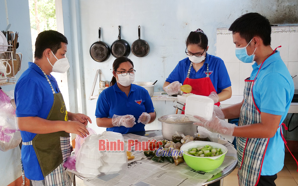 Đội hình thanh niên tình nguyện xã Thanh Phú, thị xã Bình Long chuẩn bị những suất cơm tối cho các lực lượng làm nhiệm vụ trực chốt kiểm soát và khu cách ly tập trung