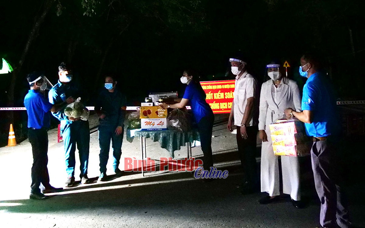 Hơn 19 giờ tối, đội hình thanh niên tình nguyện xã Minh Hưng, huyện Chơn Thành vẫn còn hỗ trợ các lực lượng làm nhiệm vụ tại chốt kiểm soát Minh Hưng đi Minh Thạnh (Phú Giáo - Bình Dương)