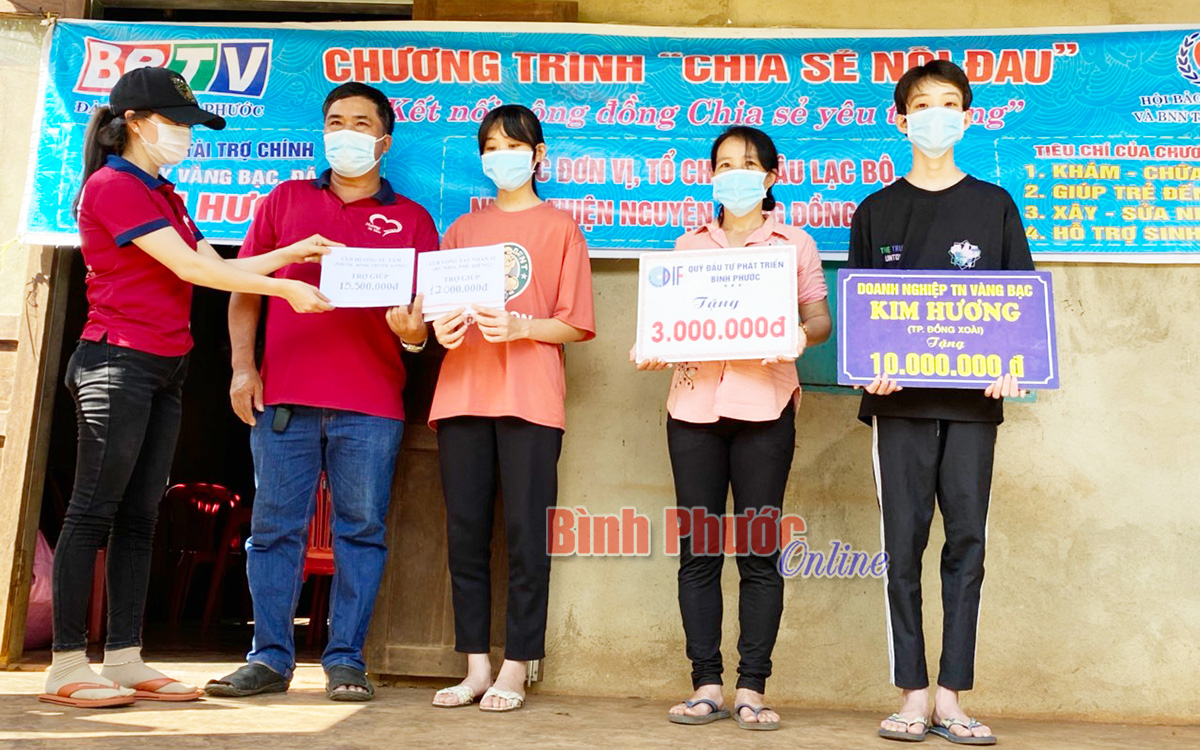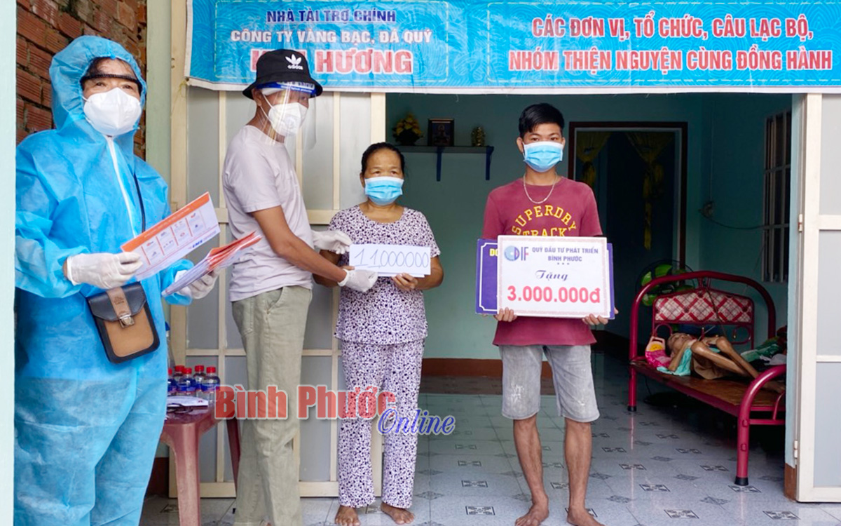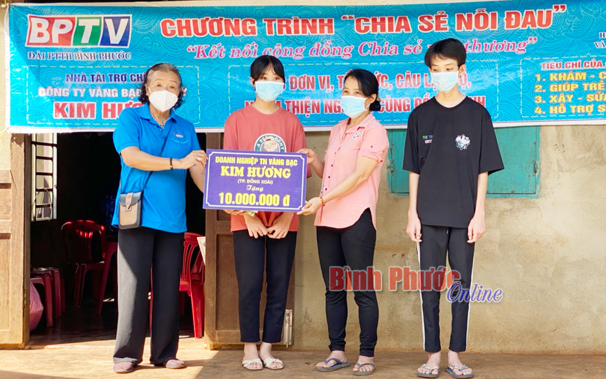 Tiếp đó, chương trình đến thăm gia đình chị Đinh Thị Thùy Hương ở thôn 1, xã Phú Văn, huyện Bù Gia Mập. Chồng chị mất vì bệnh xơ gan khi con gái lớn mới 6 tuổi, còn con trai út vừa tròn 9 tháng tuổi. Chị Hương phải gồng mình nuôi 3 con thơ ăn học. Đất đai, nhà cửa đều đã bán hết để chữa bệnh cho chồng, công việc làm thuê với mức lương ít ỏi nên cuộc sống của mấy mẹ con vô cùng chật vật. 2 năm nay, dịch bệnh kéo dài, không có việc làm ổn định khiến cuộc sống càng khó khăn. Các con của chị đang phải đối diện với nguy cơ phải nghỉ học. Để kịp thời hỗ trợ gia đình, chương trình đã kết nối trao tặng mẹ con chị gần 90 triệu đồng.