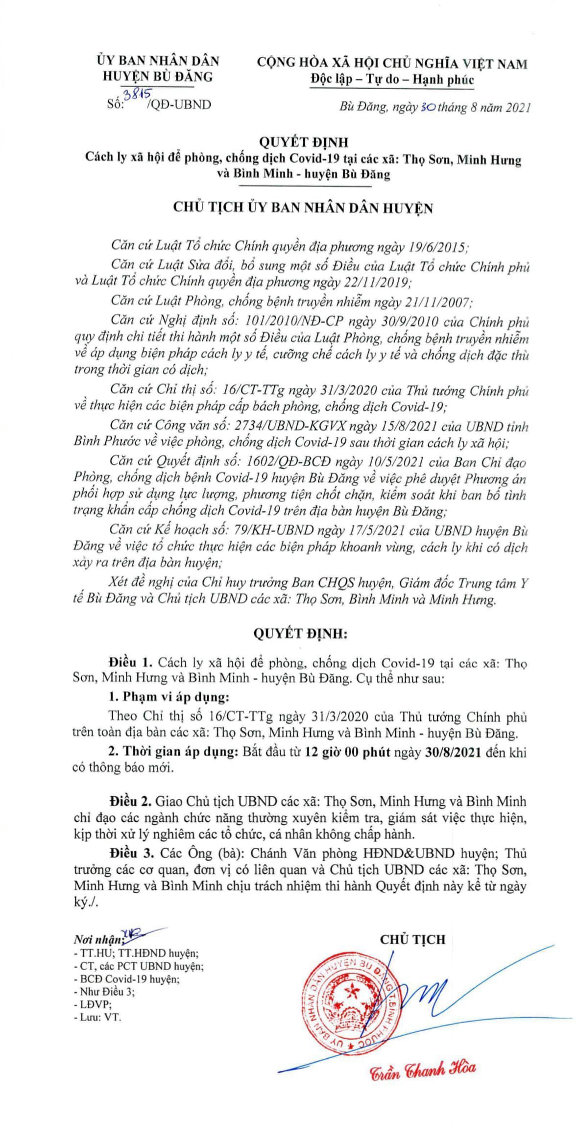 Đây là nội dung tại Quyết định số 3815/QĐ-UBND ngày 30-8 của Chủ tịch UBND huyện Bù Đăng.