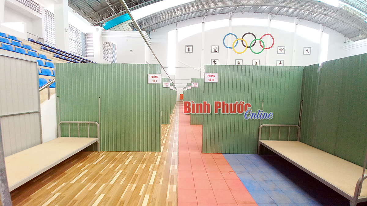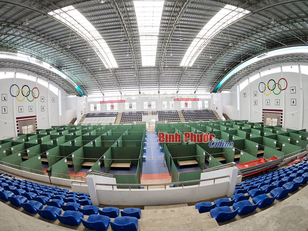 Toàn bộ khu vực bên trong nhà thi đấu được tận dụng để lắp đặt các buồng ở dã chiến cho những trường hợp cách ly đã hoàn thiện cơ bản