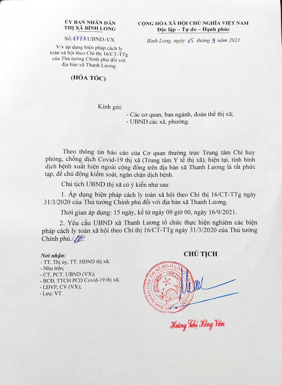 BPO - Ngày 15-9, UBND thị xã Bình Long đã ban hành Công văn hỏa tốc 1778/UBND-VX về áp dụng biện pháp cách ly toàn xã hội theo Chỉ thị 16/CT-TTg ngày 31-3-2020 của Thủ tướng Chính phủ đối với địa bàn xã Thanh Lương.