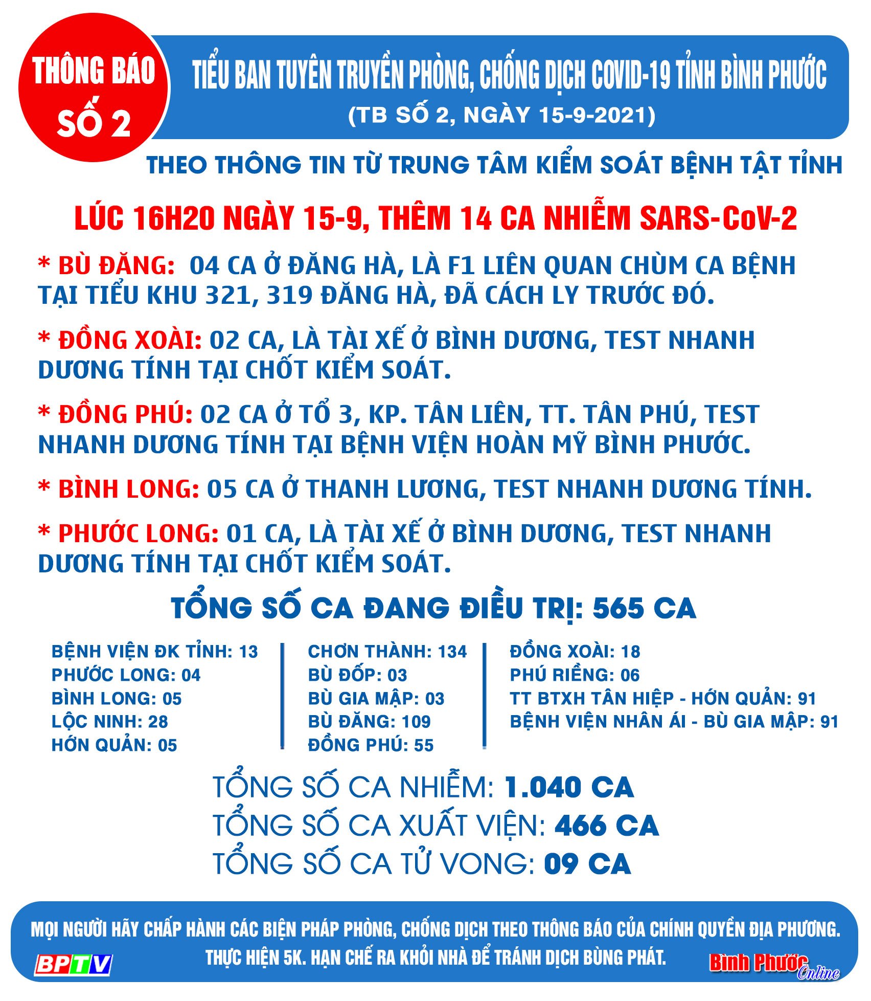 Tính đến 18 giờ ngày 15-9, toàn tỉnh Bình Phước đã ghi nhận 1.040 ca dương tính với SARS-CoV-2 tại 11/11 huyện, thị xã, thành phố. Cụ thể: Chơn Thành 194; Bù Đăng 152; Đồng Xoài 91; Đồng Phú 112; Lộc Ninh 86; Bù Gia Mập 52; Bù Đốp 42; Hớn Quản 40; Phước Long 26; Bình Long 20; Phú Riềng 11; Số ca ngoài tỉnh: 215 (Trung tâm bảo trợ xã hội Bình Đức - Bù Gia Mập 65; Trung tâm bảo trợ xã hội Tân Hiệp - Hớn Quản 149).