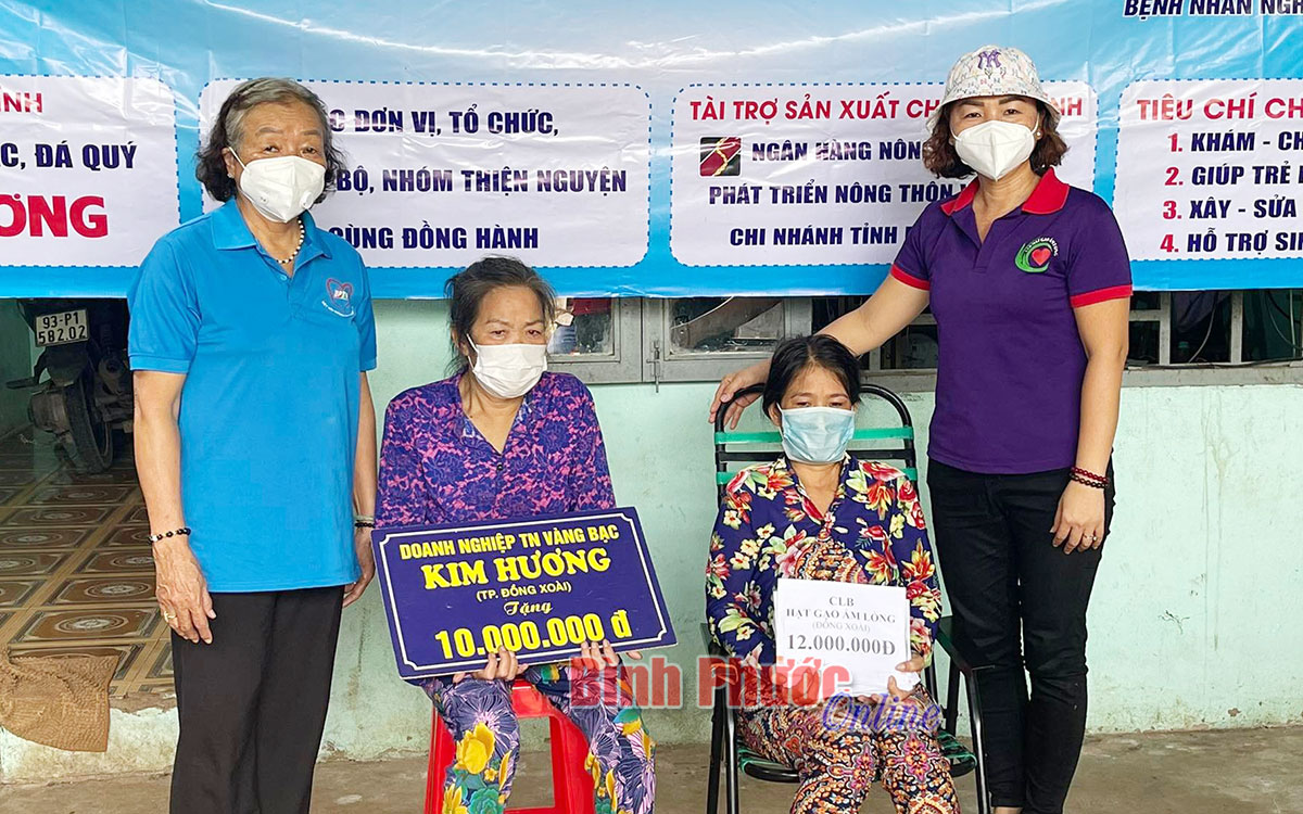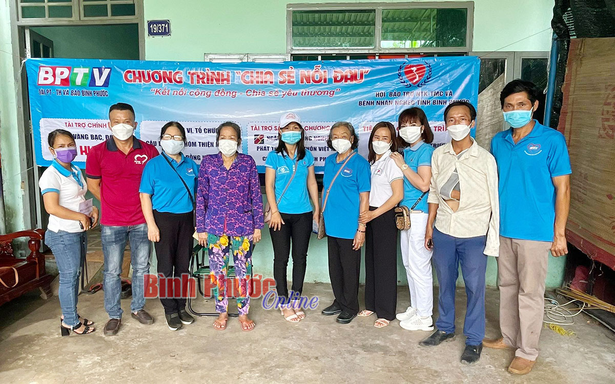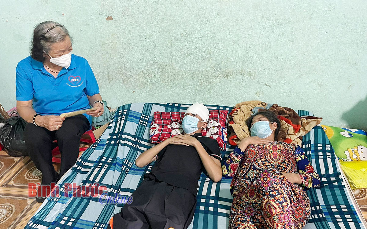 Hoàn cảnh thứ nhất được hỗ trợ là chị Lê Thị Hồng (SN 1982) ở ấp 1, xã Tiến Hưng, TP. Đồng Xoài. Chị Hồng phát hiện mắc bệnh ung thư tử cung sau khi sinh bé Trần Hồng Thương vào năm 2016. Đất đai, nhà cửa bán hết nhưng cũng không đủ tiền chữa trị nên căn bệnh dần biến chứng sang ung thư xương, khiến chị không thể đi lại được. Cuộc sống chưa tìm ra lối thoát thì tháng 10 vừa qua, người con trai lớn của chị Hồng là em Đặng Văn Tài bị tai nạn giao thông, dẫn đến chấn thương sọ não.