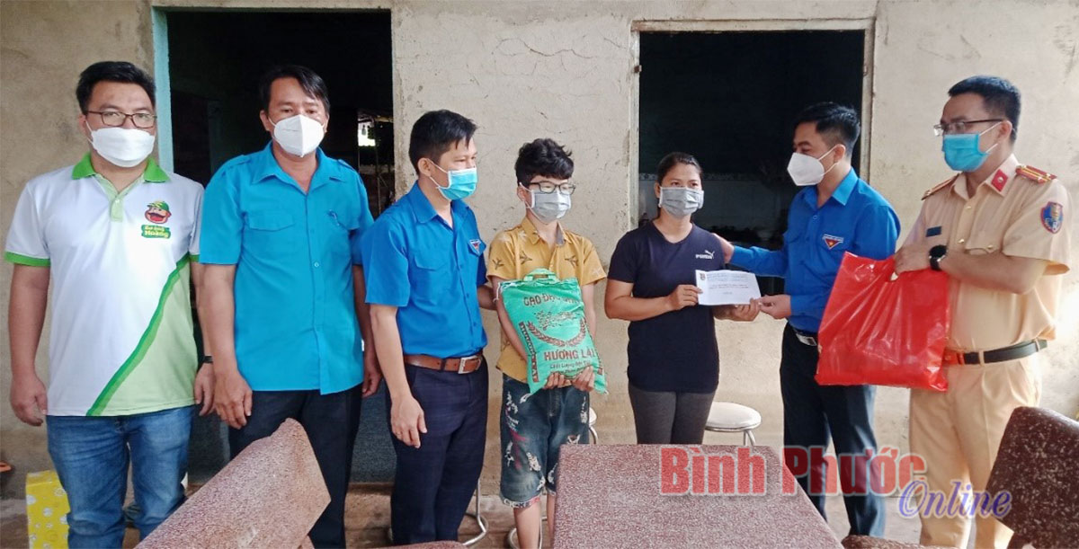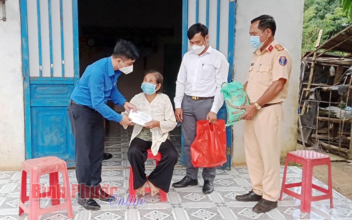 Bí thư Tỉnh đoàn Trần Quốc Duy (bìa trái) thăm, tặng quà, động viên gia đình bà Nguyễn Thị Sợi ở khu phố Thanh Xuân, thị trấn Thanh Bình, huyện Bù Đốp có 3 con (trai, dâu, rể) tử vong do tai nạn giao thông, mình bà nuôi 3 cháu nội, hoàn cảnh kinh tế rất khó khăn