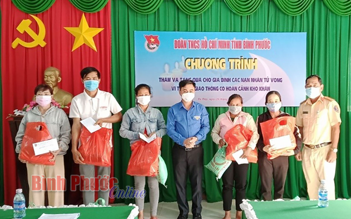 Bí thư Tỉnh đoàn Trần Quốc Duy (giữa) tặng quà các gia đình có người thân tử vong do tai nạn giao thông ở huyện Bù Đốp