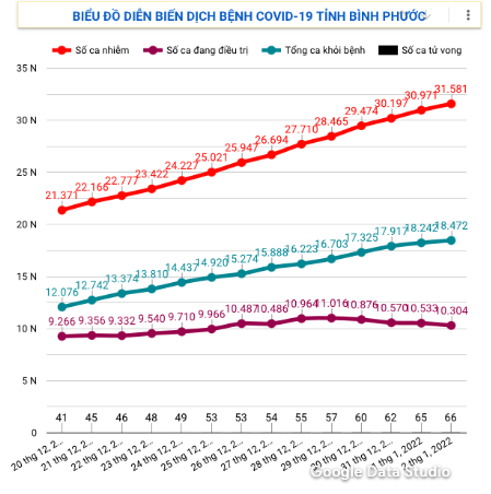 Theo Trung tâm kiểm soát bệnh tật tỉnh Bình Phước, tính đến 08 giờ ngày 03-01, Bình Phước đã ghi nhận 31.581 ca nhiễm SARS-CoV-2 tại 11/11 huyện, thị xã, thành phố (trong đó, 20.384 ca PCR dương tính, 11.197 ca test nhanh dương tính). Có 10.304 bệnh nhân đang được theo dõi, điều trị (bao gồm PCR và test nhanh); 18.472 người đã xuất viện và 66 ca tử vong. |