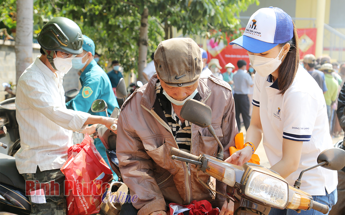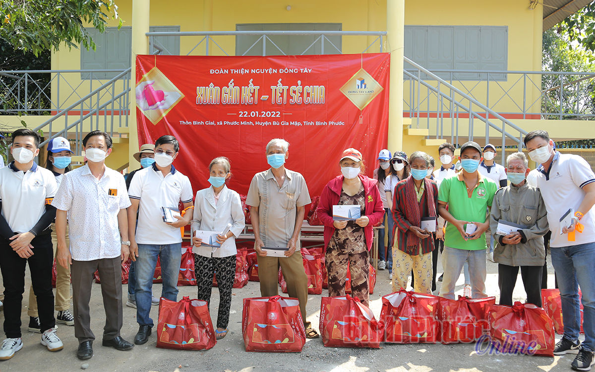 Lãnh đạo Công ty Cổ phần Đông Tây Land tặng quà những người có hoàn cảnh khó khăn ở thôn Bình Giai, xã Phước Minh, huyện Bù Gia Mập