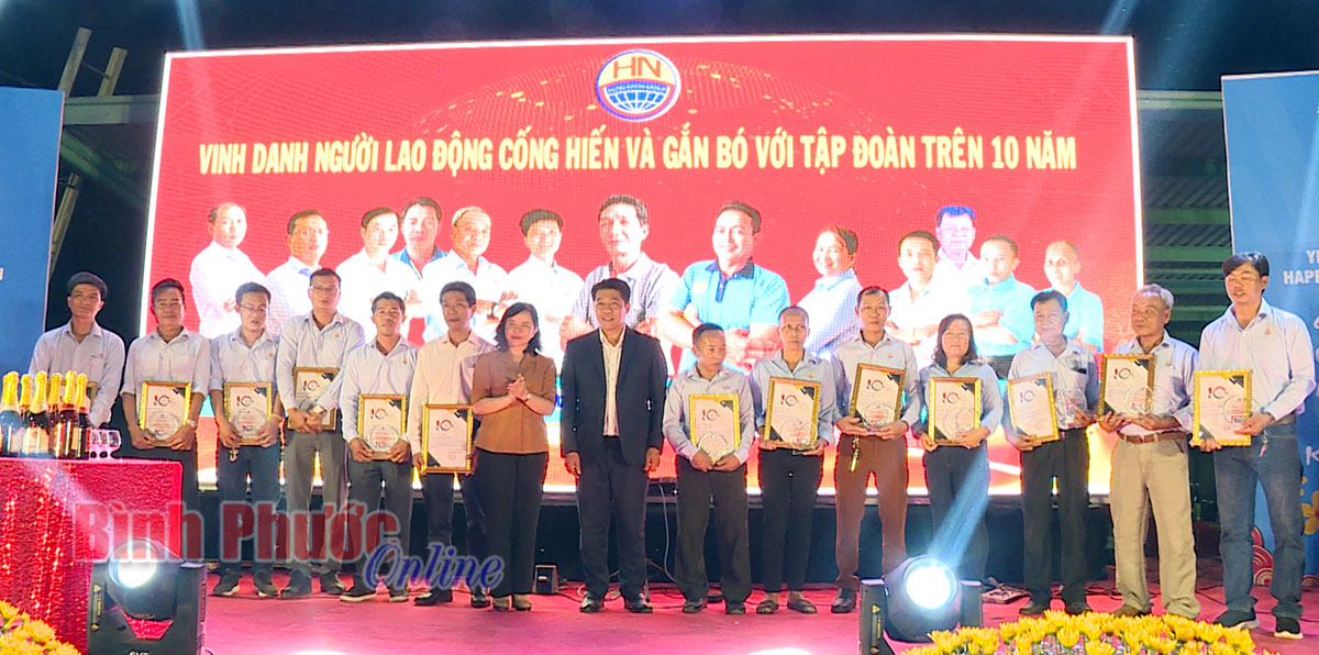 Ông Vũ Mạnh Hùng, Chủ tịch Hội đồng quản trị Tập đoàn Hùng Nhơn Việt Nam và bà Nguyễn Thị Hương Giang, Tỉnh ủy viên, Chủ tịch Liên đoàn Lao động tỉnh trao tặng kỷ niệm chương và bảng vinh danh tri ân những cán bộ, nhân viên đã gắn bó với tập đoàn hơn 10 năm qua