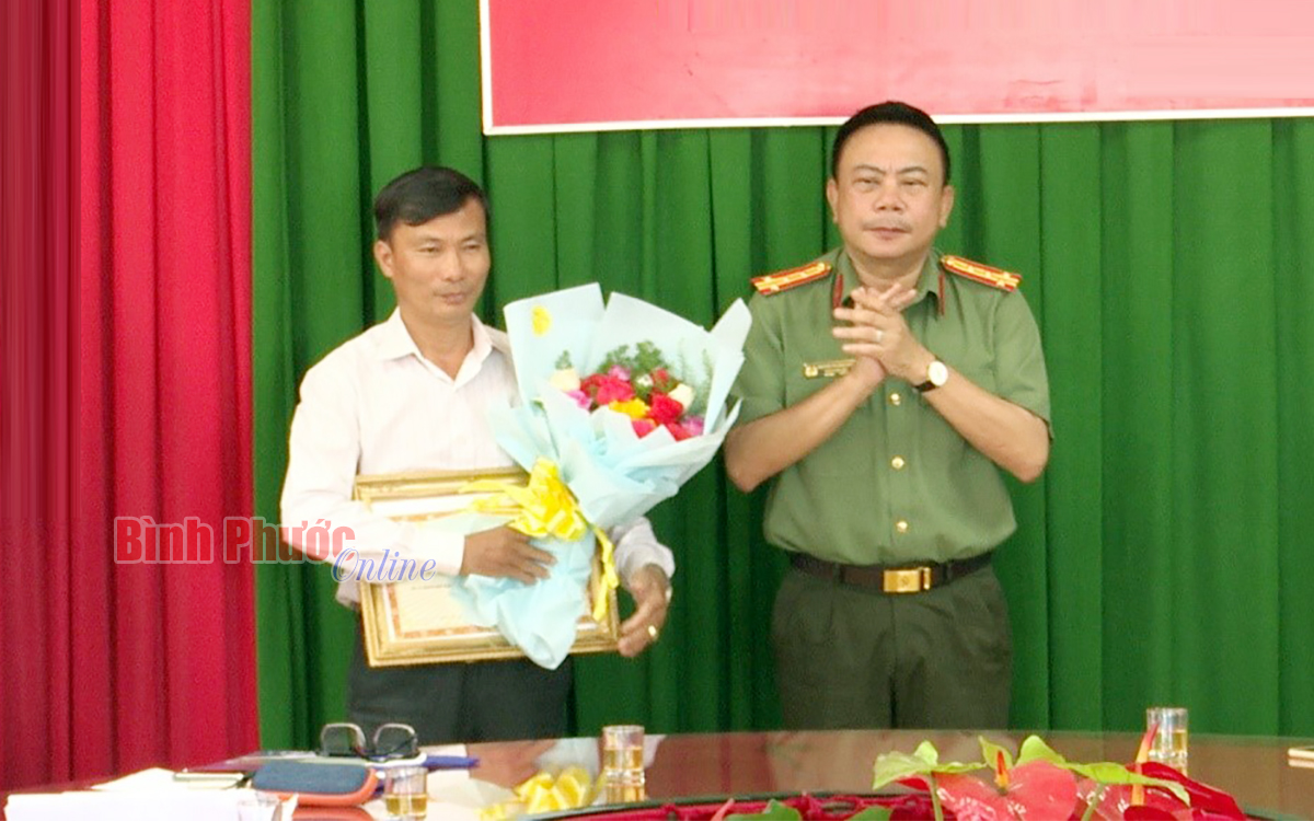 Thừa ủy quyền của Bộ trưởng Bộ Công an, Đại tá Nguyễn Phương Đằng, Phó giám đốc Công an tỉnh trao tặng bằng khen của Bộ Công an cho cán bộ và nhân dân xã Lộc An, huyện Lộc Ninh