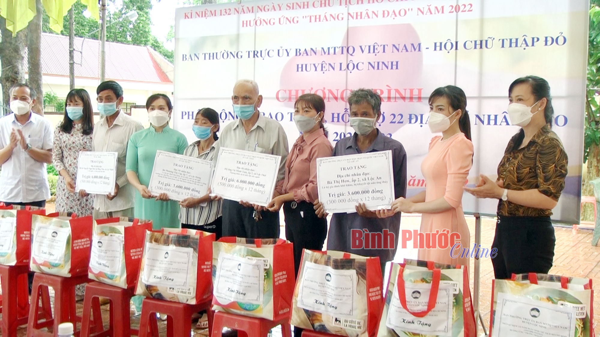 Dịp này, ban tổ chức đã trao 22 phần quà và biểu tượng tượng trưng hỗ trợ thường xuyên cho 22 địa chỉ nhân đạo trên địa bàn huyện. Trong đó, 8 cá nhân được hỗ trợ thường xuyên 300 ngàn đồng/tháng; 13 hộ được hỗ trợ 500 ngàn đồng/tháng và hỗ trợ 42 triệu đồng/năm cho Trung tâm bảo trợ xã hội tỉnh Bình Phước để chăm sóc các đối tượng đang sinh sống tại trung tâm. Tổng kinh phí hỗ trợ thường xuyên cho 22 địa chỉ nhân đạo trên địa bàn huyện Lộc Ninh là khoảng 162 triệu đồng.