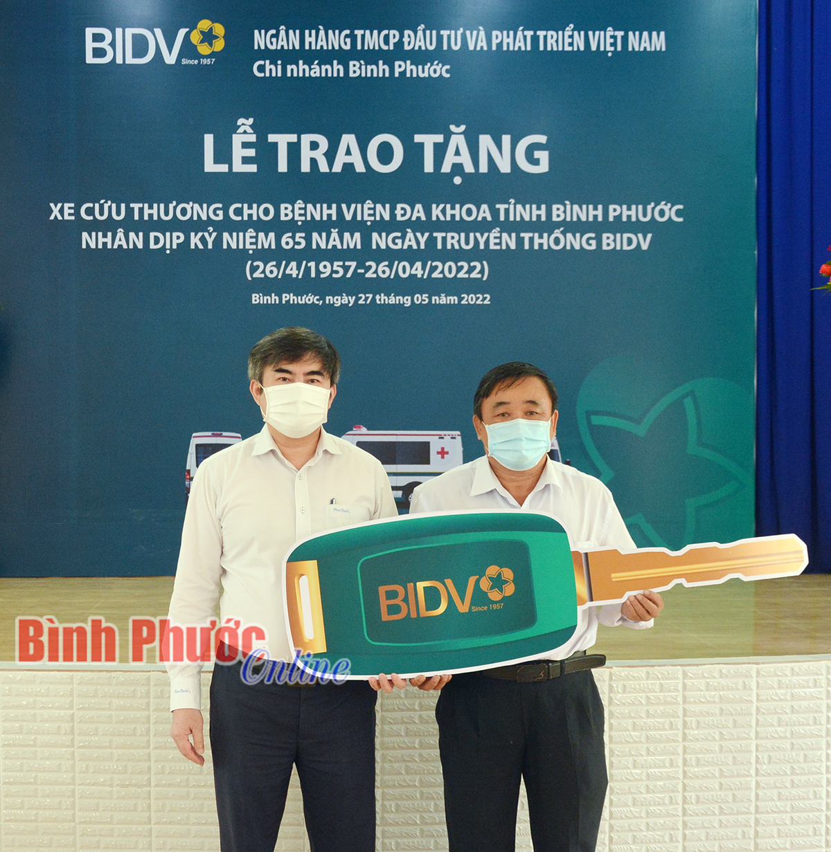 Lãnh đạo BIDV Bình Phước trao biểu trưng tặng xe cứu thương trị giá 1,2 tỷ đồng cho Bệnh viện đa khoa tỉnh Bình Phước