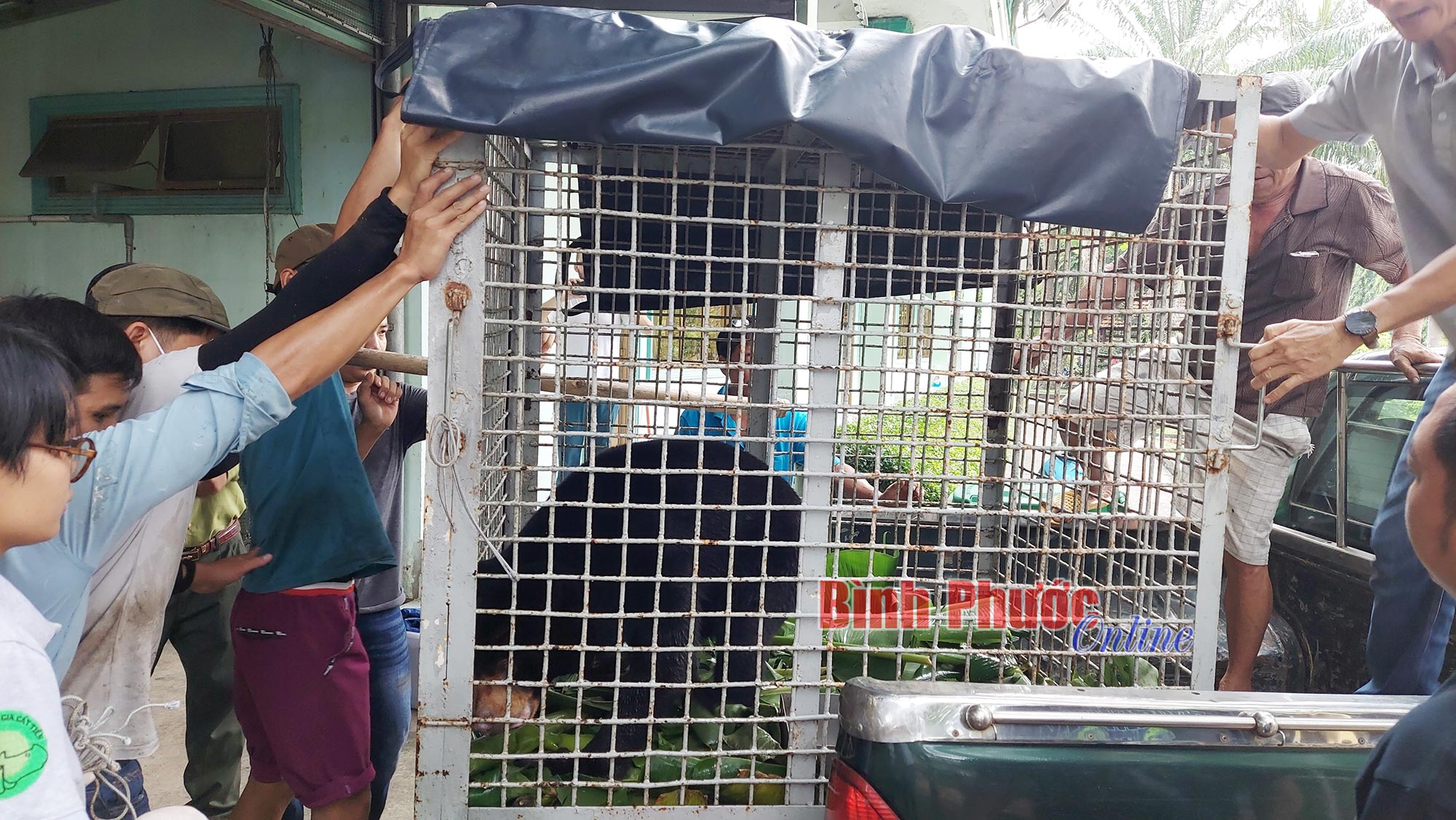 Cá thể gấu chó được các nhân viên đưa lên xe chở về Trung tâm gấu Cát Tiên