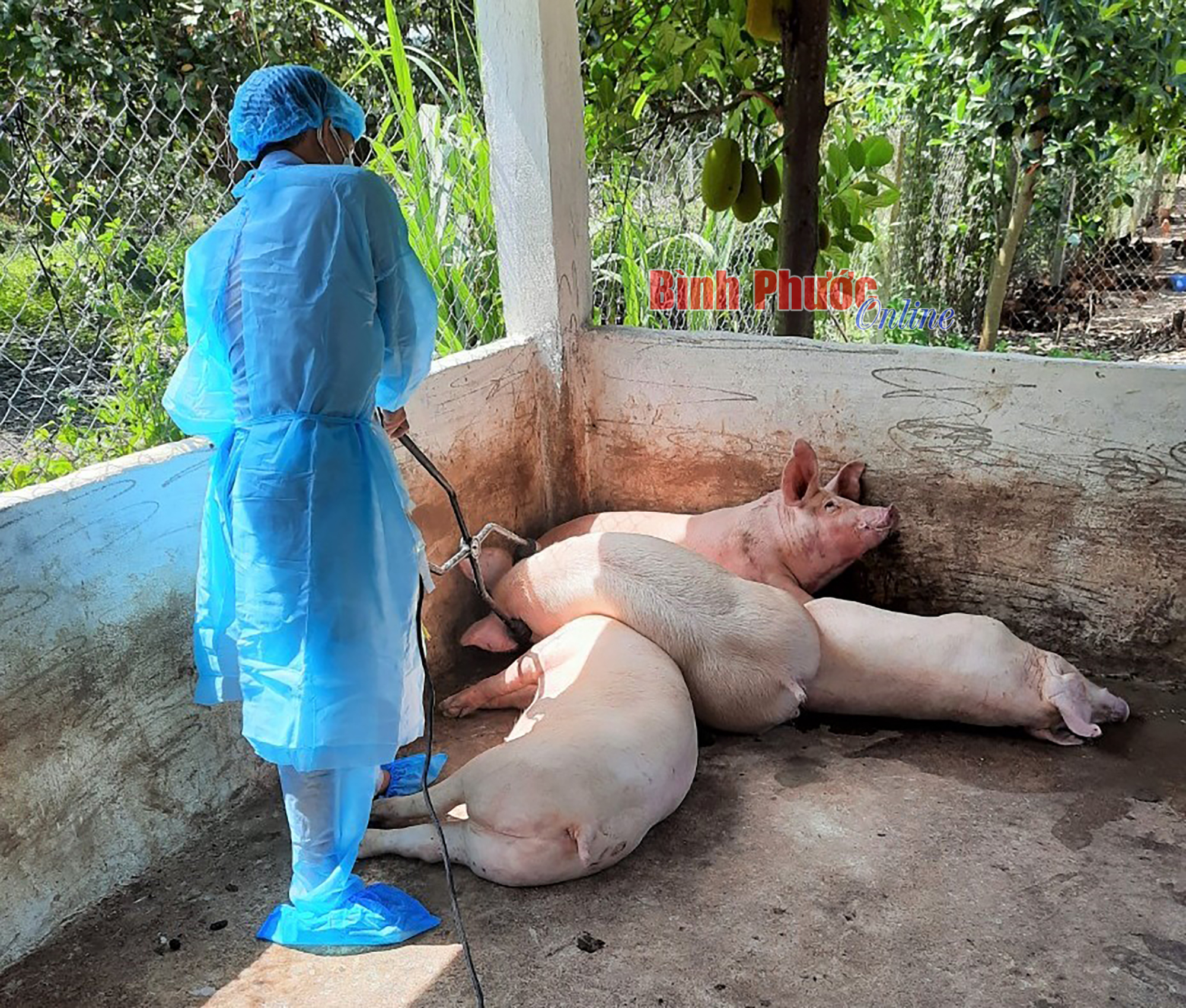 Cán bộ Trung tâm Dịch vụ nông nghiệp thành phố Đồng Xoài xử lý đàn heo nhiễm bệnh dịch tả heo châu Phi tại xã Tân Thành