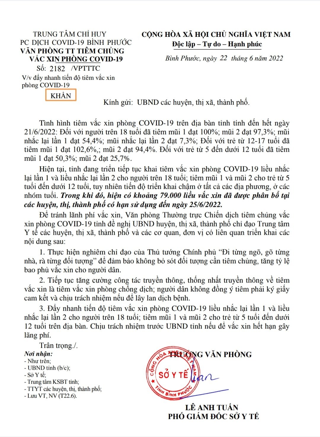 Theo Văn phòng thường trực tiêm chủng vắc xin phòng Covid-19 tỉnh Bình Phước, tính đến hết ngày 21-6-2022, người trên 18 tuổi đã tiêm mũi 1 đạt 100%, mũi 2 đạt 97,3%; mũi nhắc lại lần 1 đạt 54,4%, mũi nhắc lại lần 2 đạt 7,3%. Đối với trẻ từ 12-17 tuổi đã tiêm mũi 1 đạt 102,6%, mũi 2 đạt 94,4%. Đối với trẻ từ 5 đến dưới 12 tuổi đã tiêm mũi 1 đạt 50,3%, mũi 2 đạt 25,7%