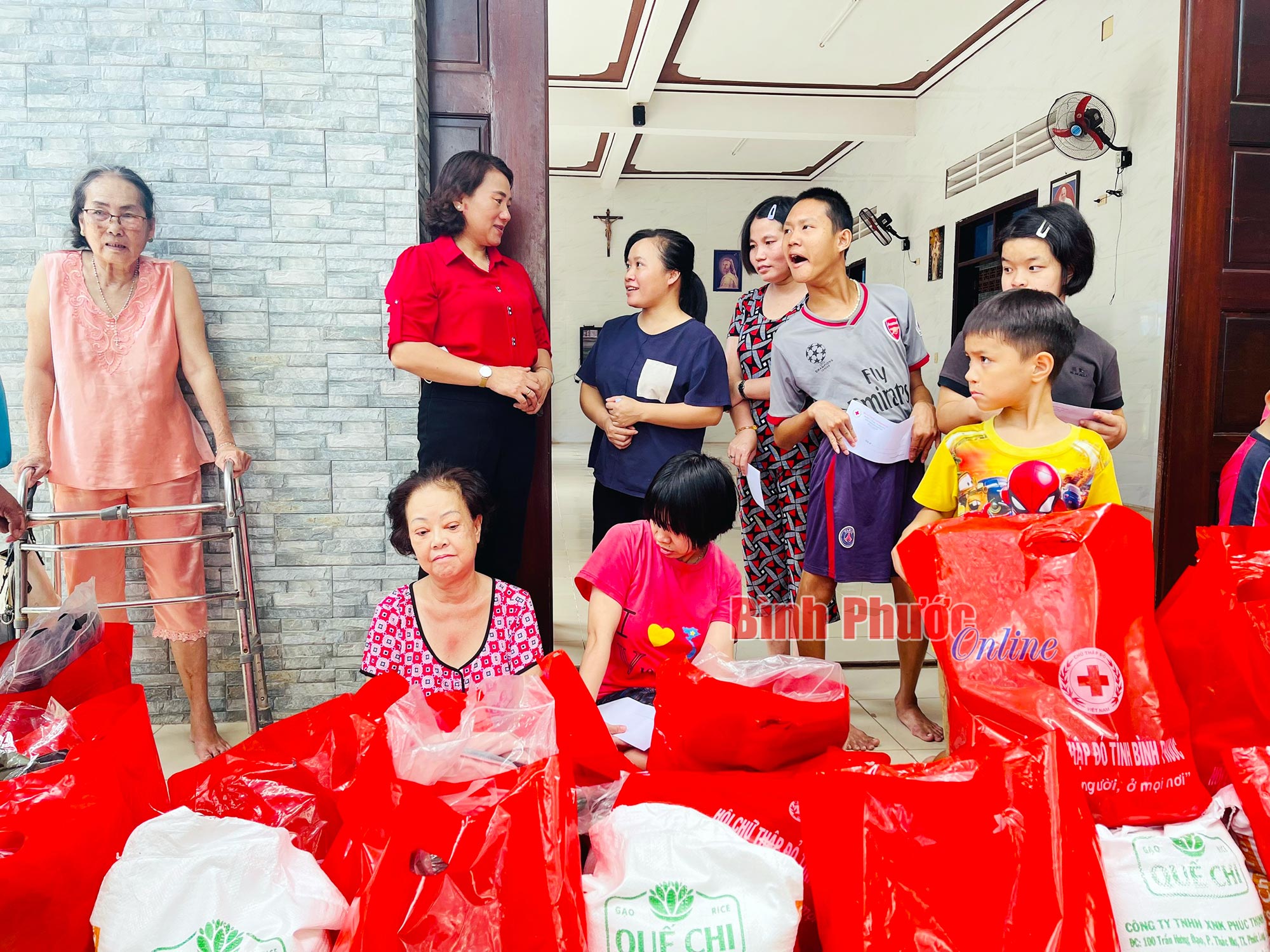 Bà Nguyễn Thị Hằng Nga, Phó chủ tịch Hội Chữ thập đỏ tỉnh tặng quà các cháu hoàn cảnh khó khăn tại Nhà dưỡng lão Thiên Ân, TP. Đồng Xoài