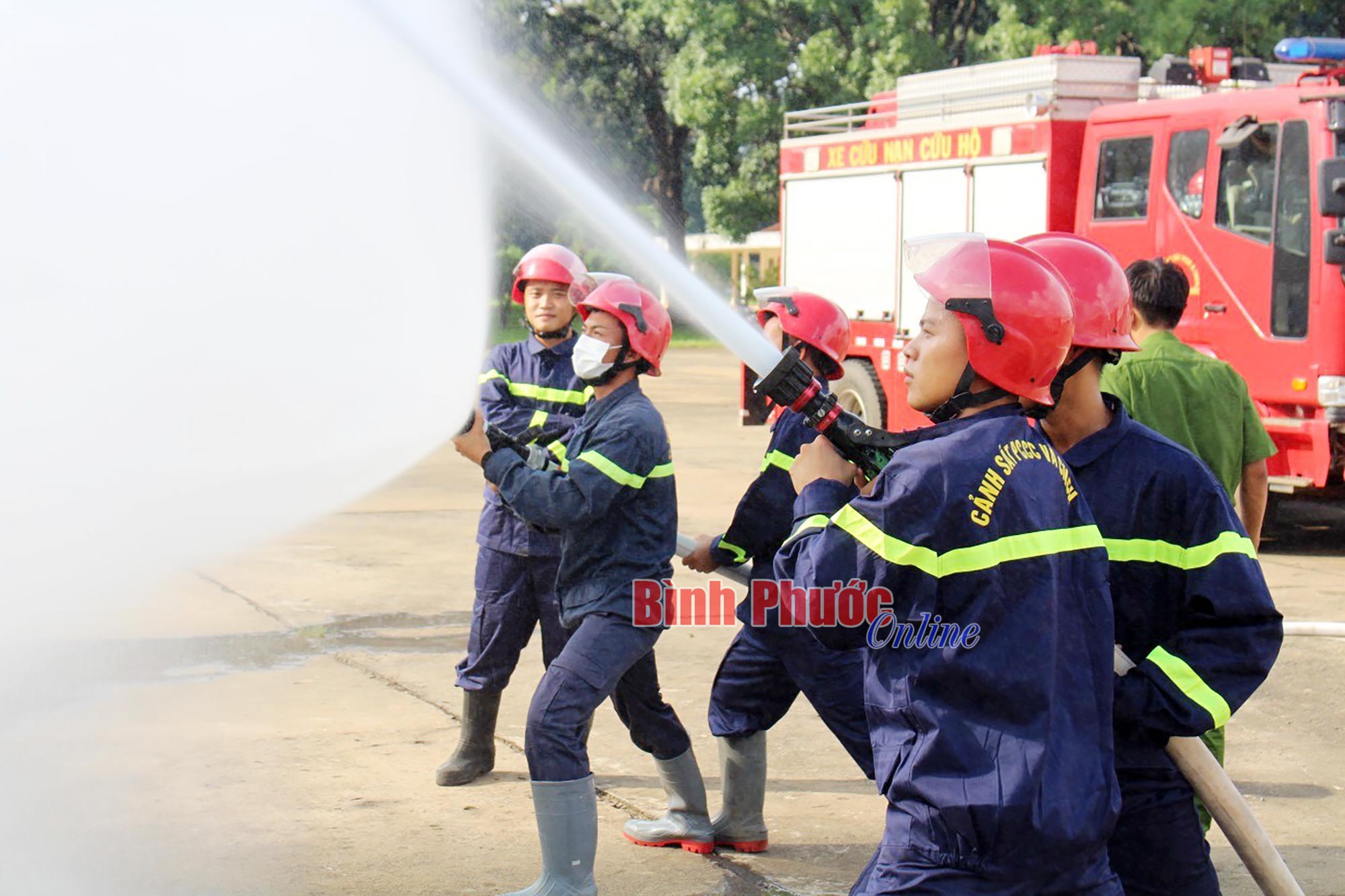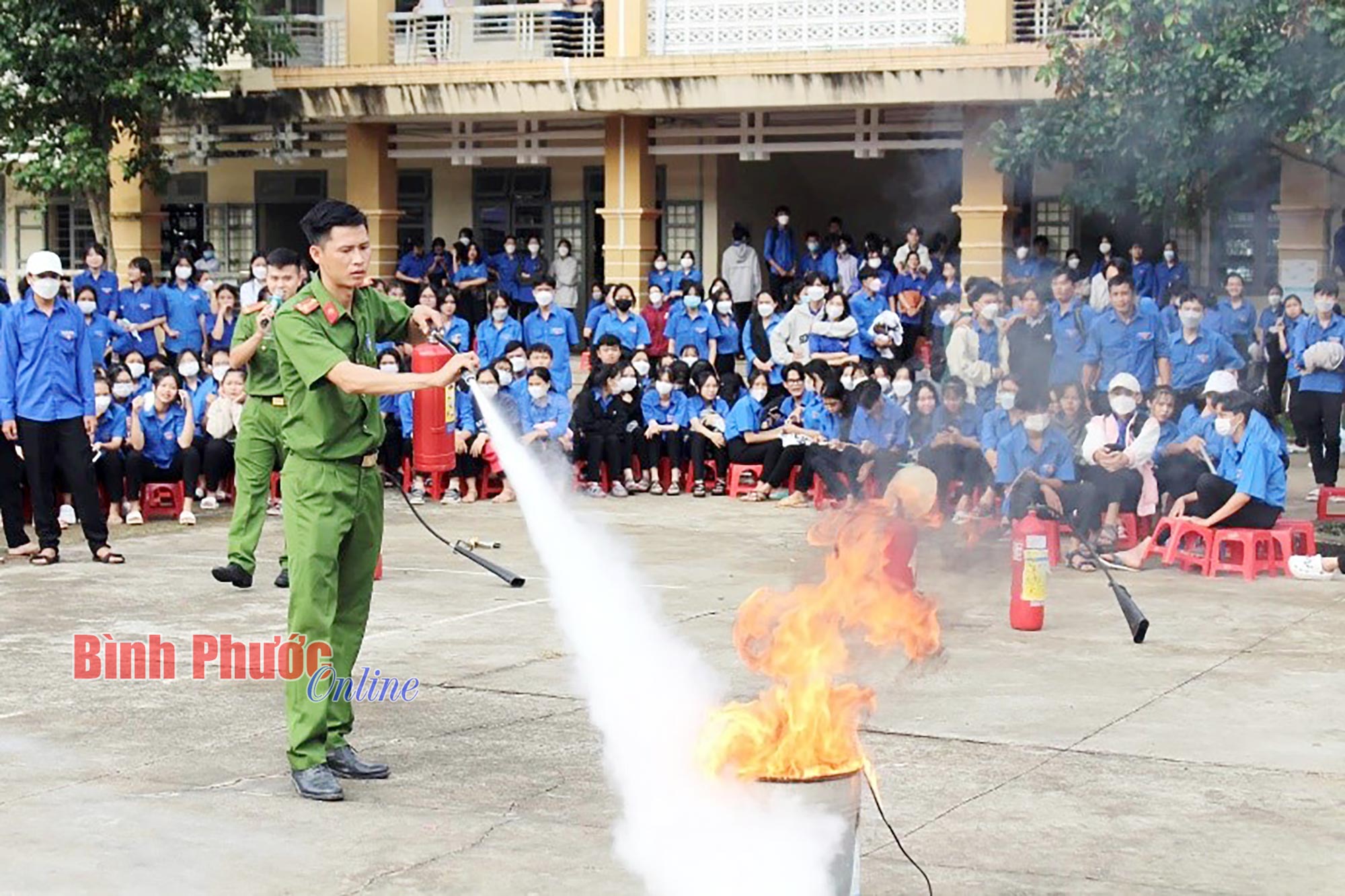 Lực lượng cảnh sát phòng cháy, chữa cháy và cứu nạn, cứu hộ Công an tỉnh Bình Phước tập huấn kỹ năng phòng cháy cho học sinh Trường THPT Phước Bình, thị xã Phước Long