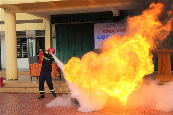 Thực hành PCCC tại các trường học ở huyện Thạch Hà, tỉnh Hà Tĩnh. Ảnh: Công Tường/TTXVN