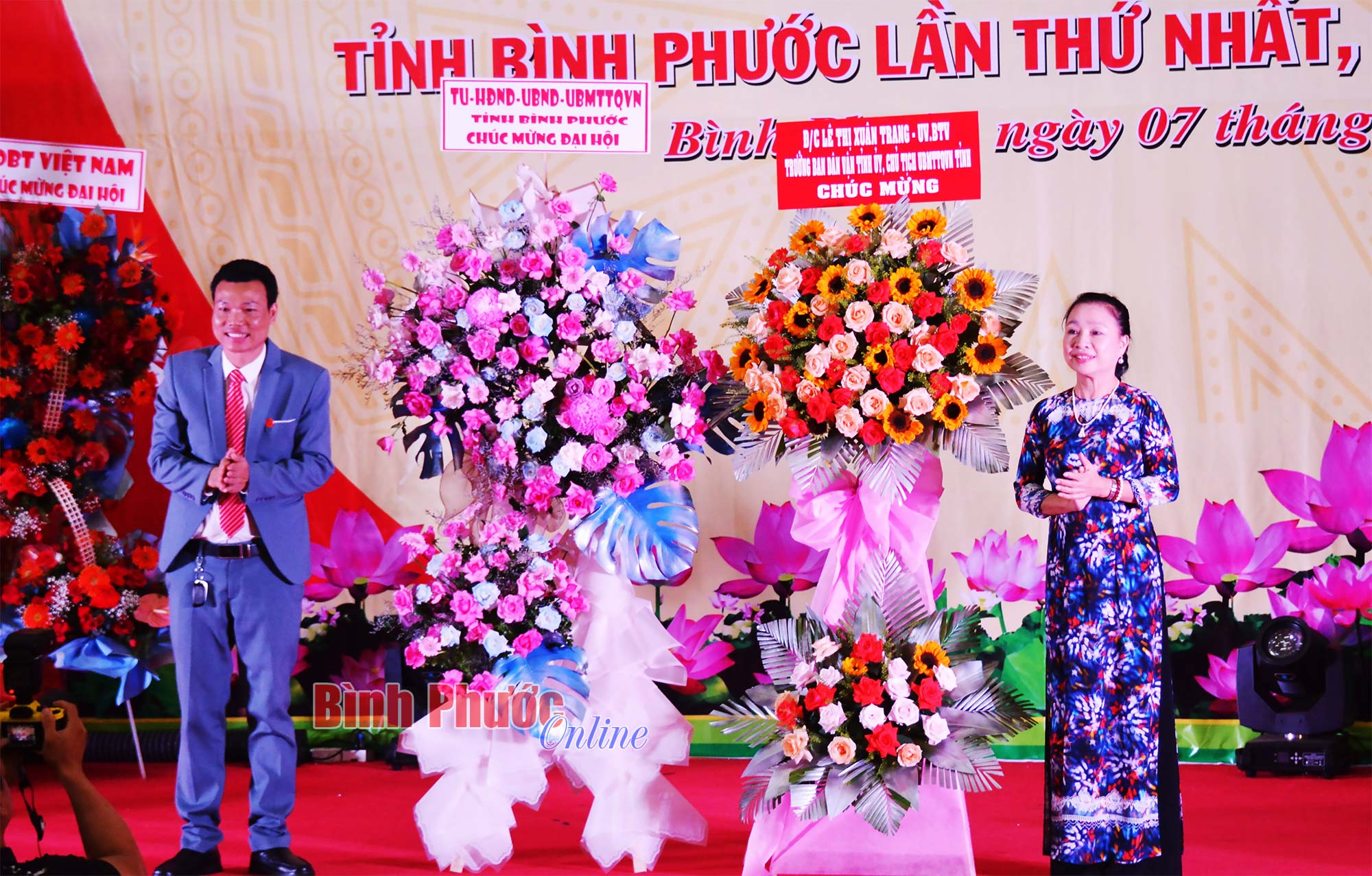 Ủy viên Ban Thường vụ, Trưởng ban Dân vận Tỉnh ủy, Chủ tịch UBMTTQVN tỉnh Lê Thị Xuân Trang tặng hoa chúc mừng đại hội