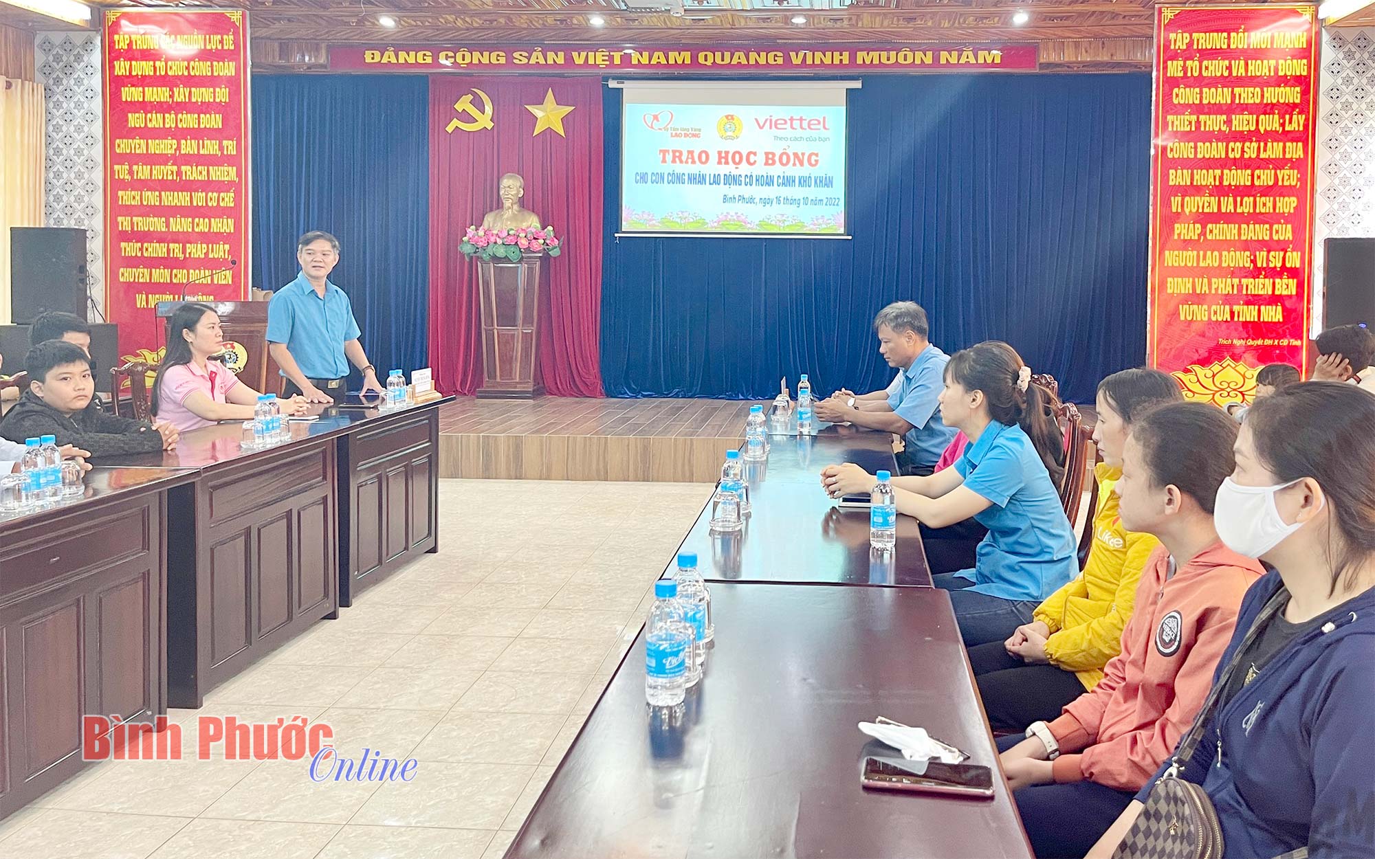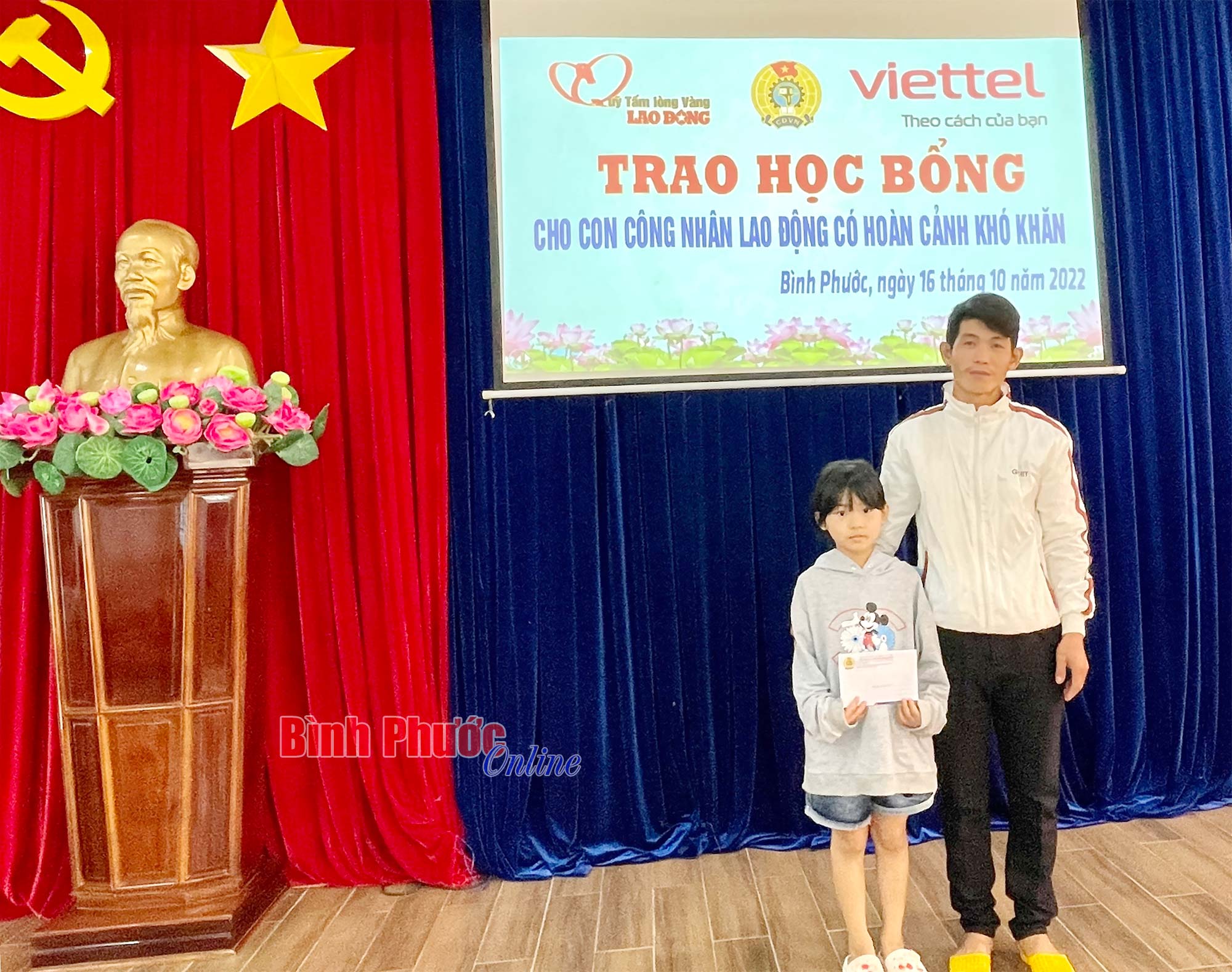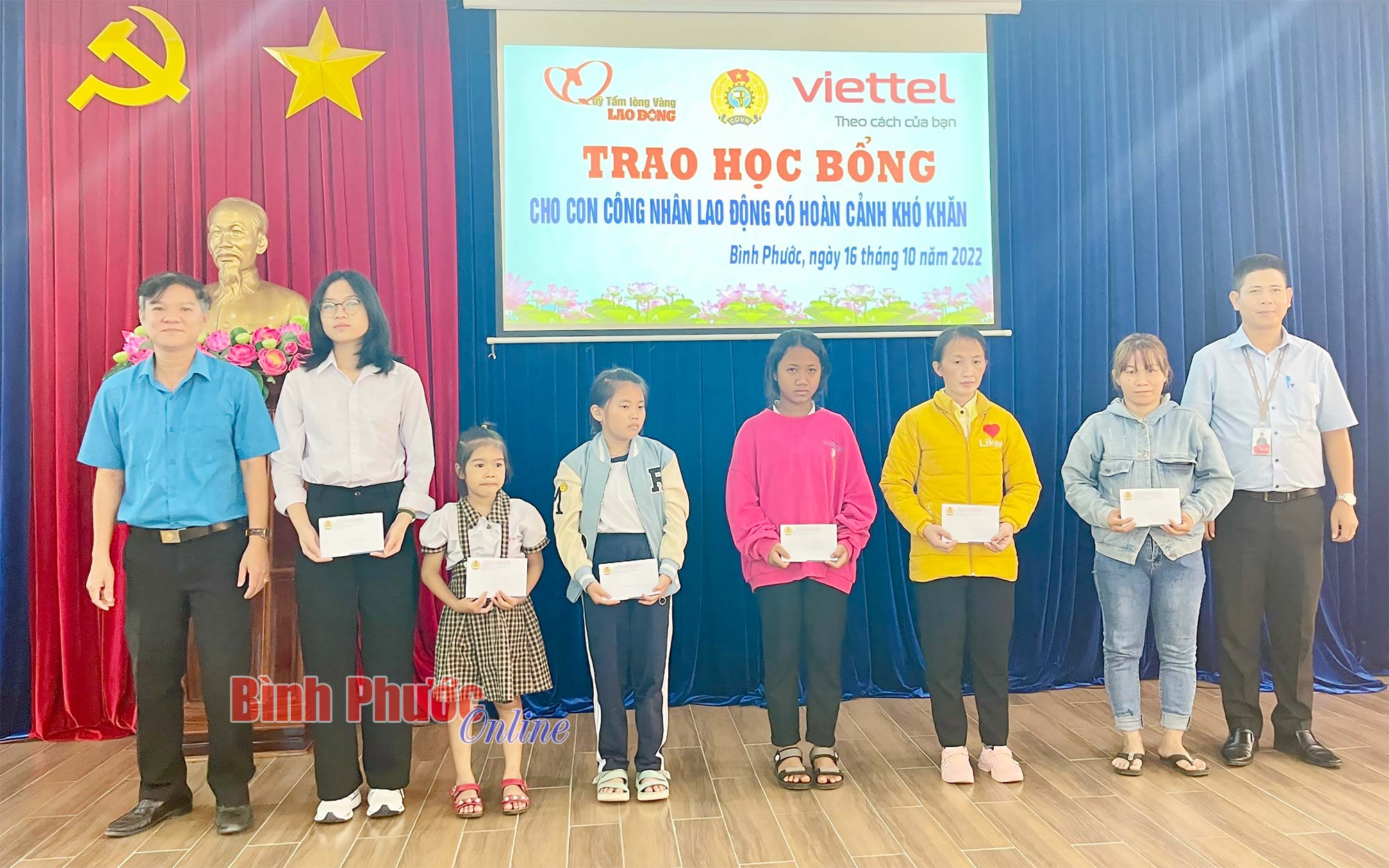 Tại chương trình, lãnh đạo các đơn vị đã trao 20 suất học bổng cho con công nhân lao động có bố gặp hoàn cảnh khó khăn; có bố, mẹ mất do dịch bệnh Covid-19. Mỗi suất học bổng trị giá 1 triệu đồng. Trong đó, 15 suất học bổng trao tại hội trường Liên đoàn Lao động tỉnh, là con đoàn viên thuộc: Công đoàn Khu công nghiệp khu vực Đồng Xoài - Đồng Phú, Liên đoàn Lao động huyện Đồng Phú, Liên đoàn Lao động thành phố Đồng Xoài. 5 suất học bổng còn lại trao tại Văn phòng Cơ quan Công đoàn các khu công nghiệp tỉnh, thị xã Chơn Thành.