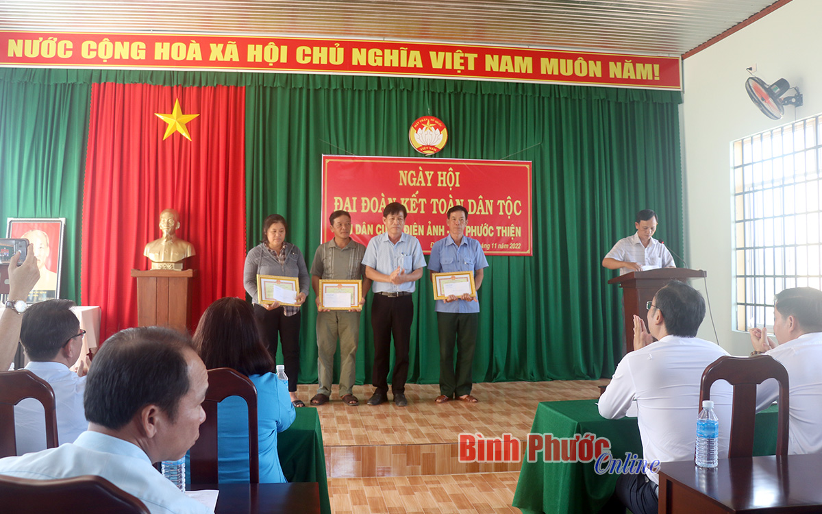 Tại ngày hội, UBND xã Phước Thiện đã tặng giấy khen 2 gia đình đạt danh hiệu gia đình, dòng họ học tập tiêu biểu năm 2022 và 18 gia đình đạt thành tích xuất sắc trong phong trào “Toàn dân đoàn kết xây dựng đời sống văn hóa” và cuộc vận động “Người Bình Phước nói lời hay làm việc tốt” năm 2022.