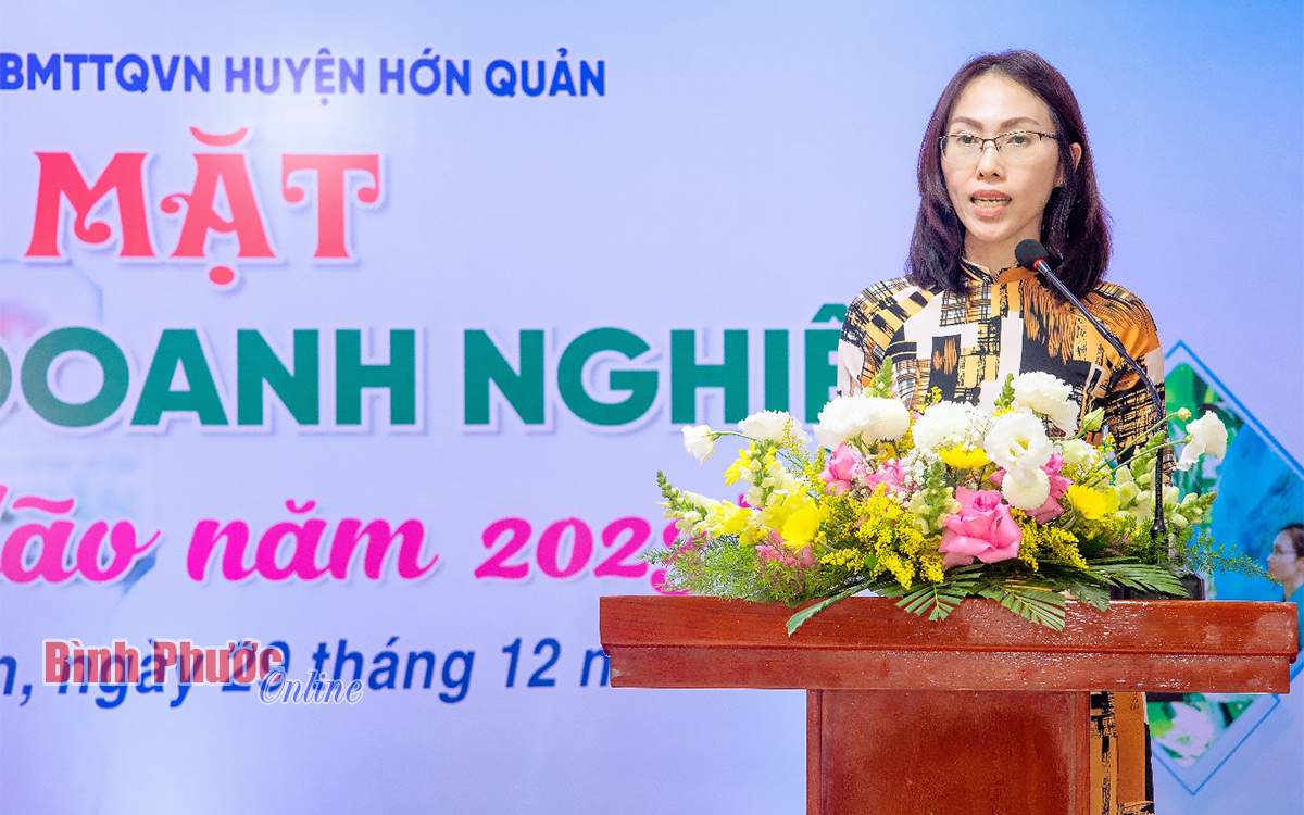 Phó Bí thư Huyện ủy, Chủ tịch UBND huyện Phan Thị Kim Oanh phát biểu tại buổi họp mặt