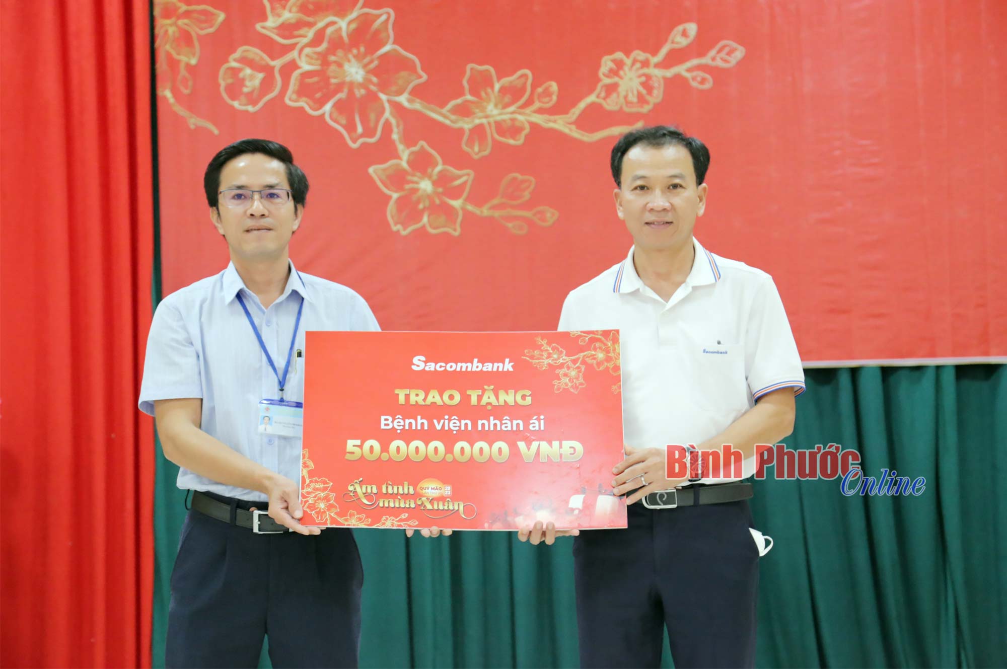 Với chủ đề “Lan tỏa yêu thương”, tại chương trình 100 phần quà, mỗi phần trị giá 500 ngàn đồng với tổng kinh phí 50 triệu đồng được Sacombank Bình Phước trao tặng các bệnh nhân tại Bệnh viện Nhân ái. Đây là hoạt động thường niên mỗi khi Tết đến Xuân về, thể hiện sự quan tâm, chăm sóc và trách nhiệm của Sacombank với cộng đồng.