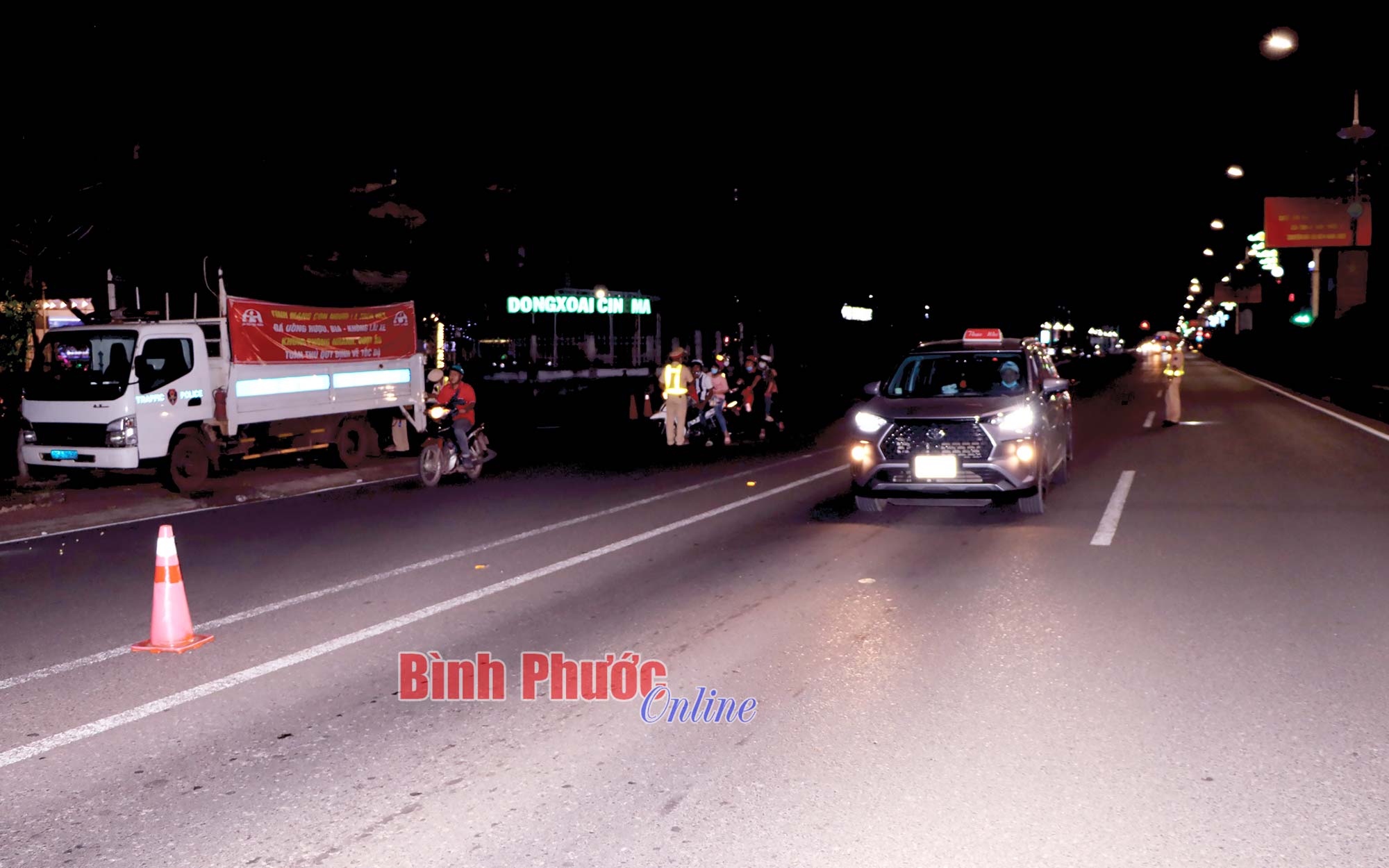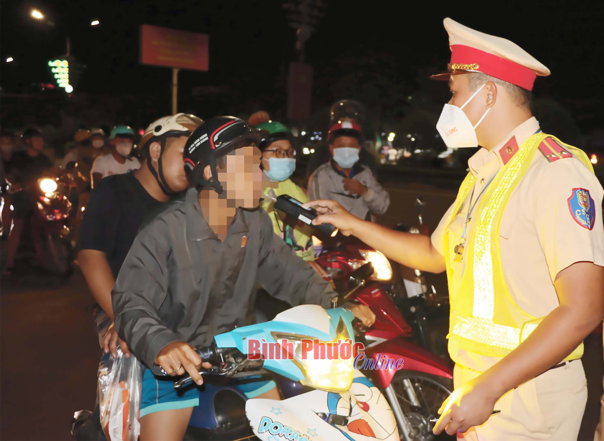 Lực lượng CSGT Công an tỉnh kiểm tra nồng độ cồn đối với người tham gia giao thông trên quốc lộ 14, đoạn qua phường Tân Phú, TP. Đồng Xoài