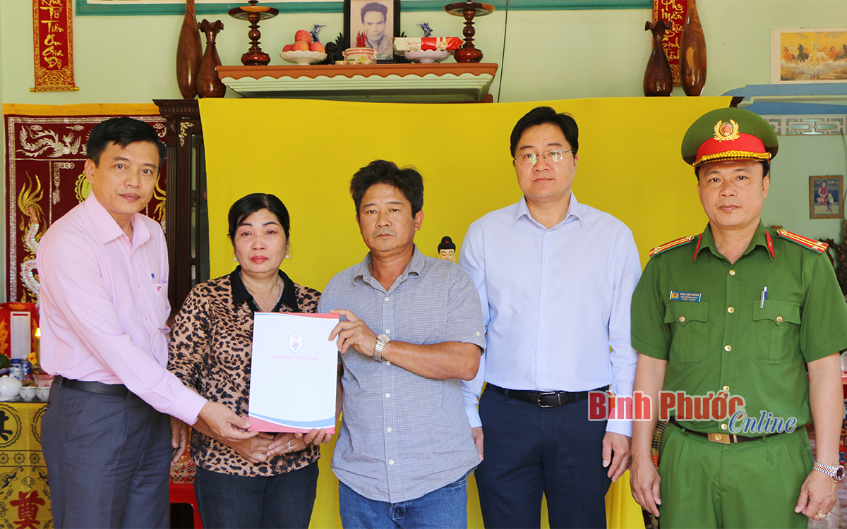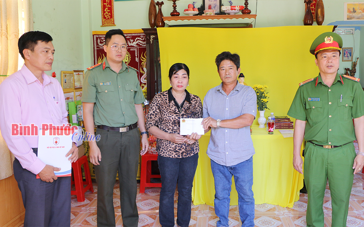 Đại diện Hiệp hội PCCC và CNCH Việt Nam, Phòng Cảnh sát PCCC và CNCH Công an tỉnh Bình Phước trao sổ tiết kiệm cho thân nhân gia đình binh nhất Hồ Kiết Tường