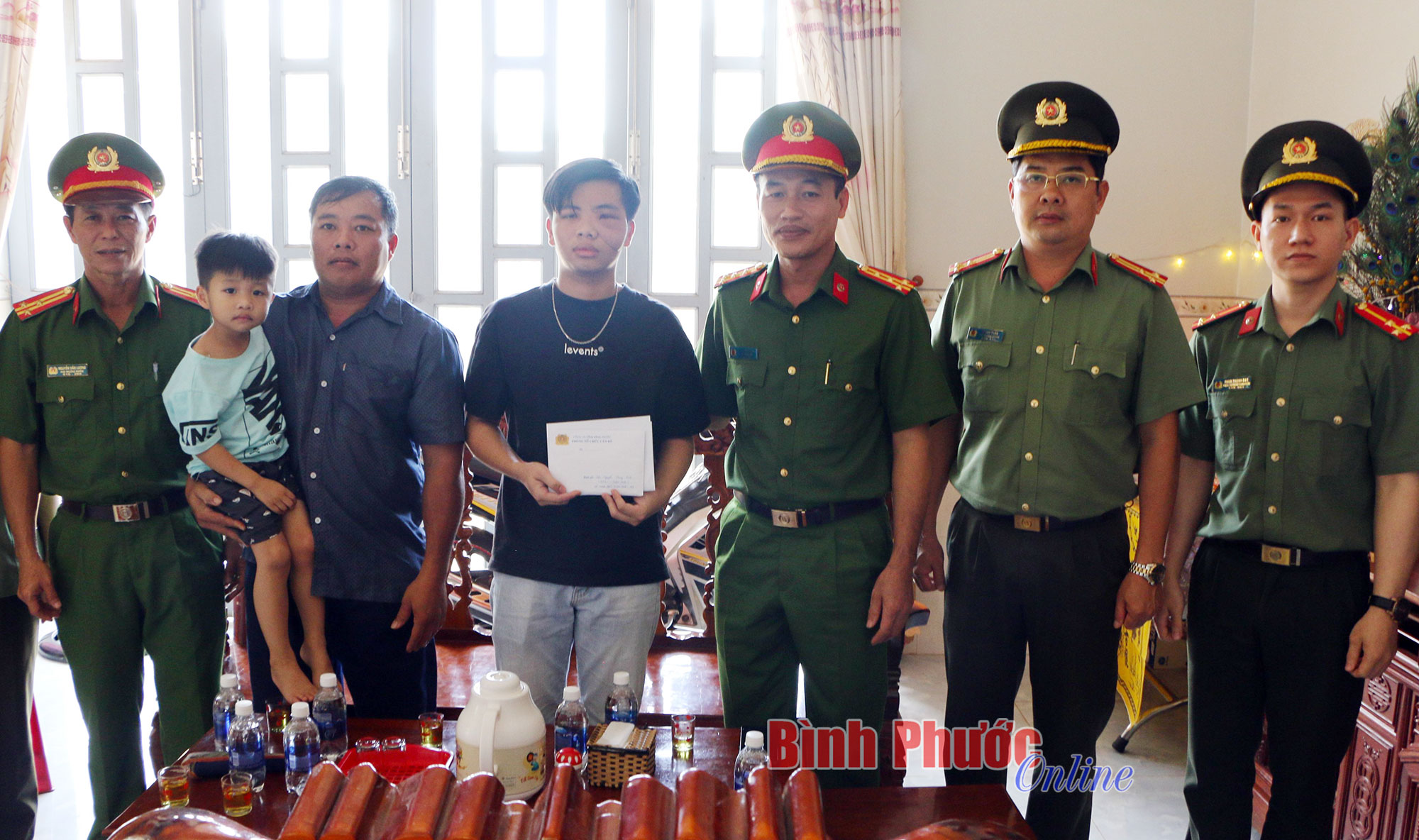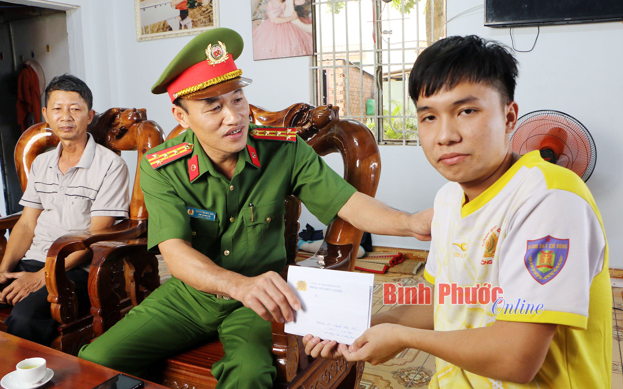 Đại tá Nguyễn Huy Hải, Phó Giám đốc Công an tỉnh trao tiền hỗ trợ cho binh nhất Nguyễn Hồng Phúc